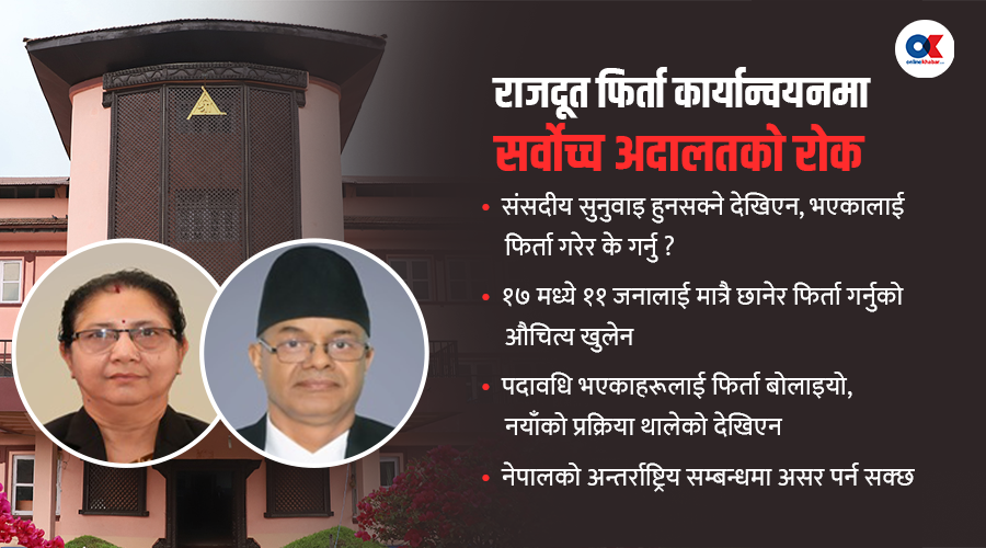 १६ कात्तिक, काठमाडौं । सर्वोच्च अदालतले ११ मुलुकहरूमा कार्यरत नेपाली राजदुतहरूलाई फिर्ता गर्ने सरकारको निर्णय कार्यान्वयन गर्न रोक लगाएको छ । न्यायाधीशहरू शारंगा सुवेदी र श्रीकान्त पौडेलको इजलासले मुद्दा नटुंगिदासम्म ती राजदुतहरूलाई फिर्ता नगराउनू भनी …