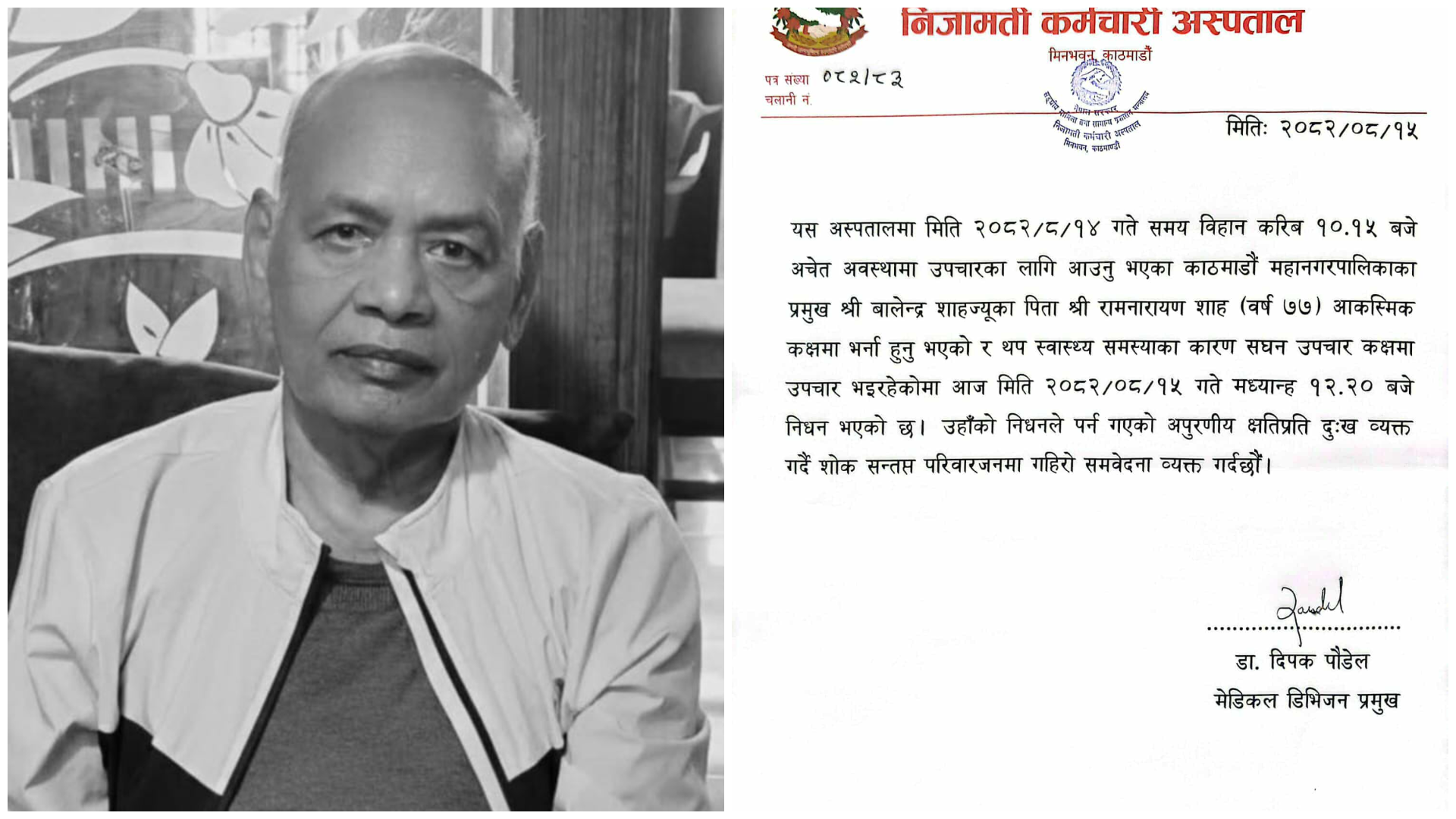 काठमाडौं– काठमाडौं महानगरपालिकाका प्रमुख बालेन्द्र शाह (बालेन) का पिता रामनारायण शाहको पार्थिव शरीर ०३ः१५ बजेसम्म पशुपति मन्दिर परिसरमा श्रद्धाञ्जलीका लागि राखिने महानगरले जनाएको छ । आइतबार उपचारको लागि नयाँ बानेश्वरस्थित सिभिल अस्पताल पुर्याइएका शाहको आज निधन भएको अस्पतालले जानकारी दिएको थियो । शाहको पिसाबमा सङ्क्रमण भएपछि शरीरमा फैलिएको थियो । उनलाई भेन्टिलेटरमा राखेर उपचार […]
