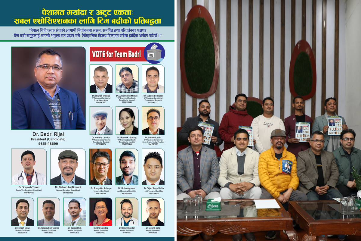 नेपाल चिकित्सक संघ (एनएमए) को आसन्न निर्वाचनका लागि डा. बद्री रिजाल नेतृत्वको समूहले आफ्नो चुनावी प्रतिबद्धता पत्र सार्वजनिक गरेको छ। 'पेशागत मर्यादा र अटुट एकता: सबल एशोसिएशनका लागि टिम बद्रीको प्रतिबद्धता' भन्ने नाराका साथ सार्वजनिक गरिएको उक्त पत्रमा चिकित्सकहरूको पेसागत सुरक्षा, पारिश्रमिक वृद्धि र दरबन्दी थप लगायतका विषयलाई मुख्य प्राथमिकतामा राखिएको छ।