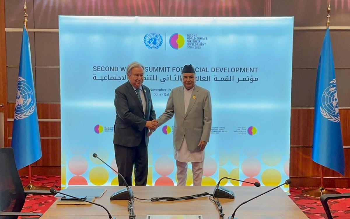 काठमाडौं– ‘सामाजिक विकासका लागि दोस्रो विश्व शिखर सम्मेलन’मा सहभागी हुने सिलसिलामा कतारको राजधानी दोहामा रहेका राष्ट्रपति रामचन्द्र पौडेलसँग संयुक्त राष्ट्रसङ्घका महासचिव एन्टोनियो गुटेरेसले आज शिष्टाचार भेट गरेका छन् । त्यस अवसरमा उनीहरुबीच कोपनहेगन प्रतिबद्धताको कार्यान्वयन, सामाजिक विकास, शान्ति, सामाजिक न्याय र दिगो विकासका साझा लक्ष्य प्राप्तिबारे विचारविमर्श भएको राष्ट्रपतिका सञ्चारविज्ञ किरण पोखरेलले बताए। राष्ट्रपतिले कोपनहेगन […]