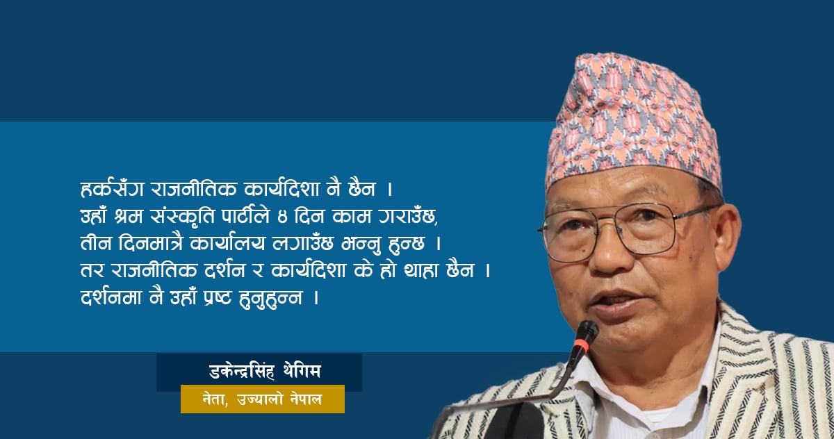 काठमाडौं- डकेन्द्रसिंह थेगिम शिक्षण पेशाबाट अवकाशपछि २०८१ वैशाख १५ गतेको इलामको उपनिर्वाचनमा उम्मेदवार भए । थेगिम त्यसबेला मुडा चुनाव चिह्नसहित पहिचानको मुद्दा लिएर उम्मेदवार बनेका थिए । तत्कालीन प्रदेश १ सरकारले कोशी नामाकरण गरेपछि पहिचानका नाममा पूर्वमा ठूलो आन्दोलन भएको थियो । त्यही आन्दोलनपछि भएको उपनिर्वाचनमा उदाएका नेता थेगिमलाई धरान उपमहानगरपालिकाका मेयर हर्क साम्पाङले साथ […]