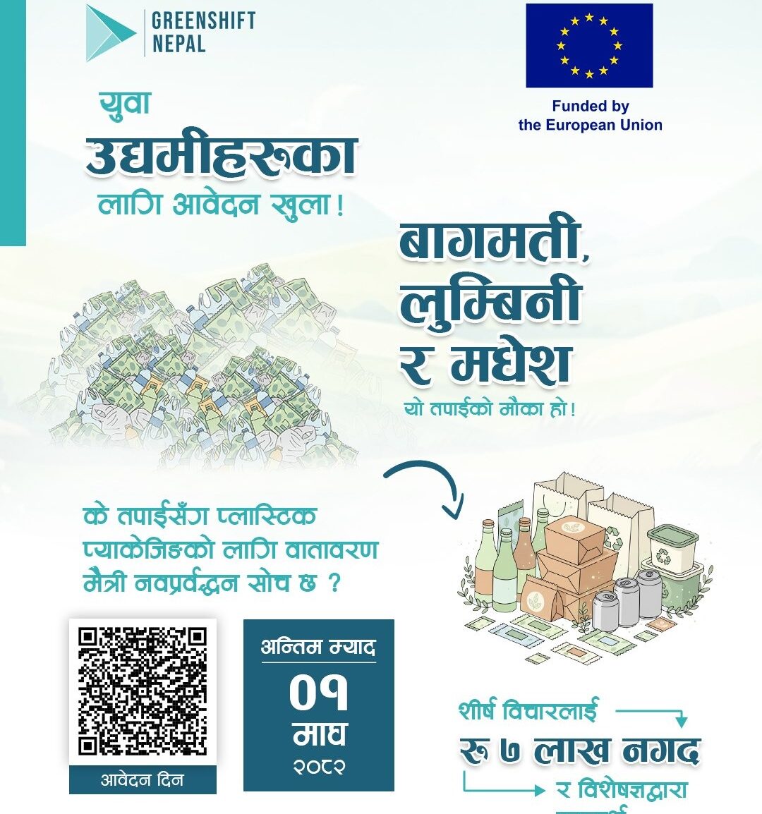 काठमाडौं– युरोपियन युनियन (ईयू) ले दिगो प्याकेजिङ प्रवर्द्धन गर्ने उद्देश्यले युवा उद्यमीहरूलाई लक्षित गर्दै ७ लाख रुपैयाँ बराबरको अनुदानका लागि नवीन नवप्रवर्तन आइडिया (सोच) पेश गर्न आह्वान गरेको छ । ईयूको सहयोगमा क्रिएसन नेपालद्वारा सञ्चालित ग्रिनसिफ्ट नेपाल परियोजना अन्तर्गत प्लास्टिक झोलाको विकल्पमा प्रयोग गर्न सकिने वातावरणमैत्री र दिगो प्याकेजिङसम्बन्धी नवीन आइडिया प्रस्तुत गर्ने एक उत्कृष्ट […]