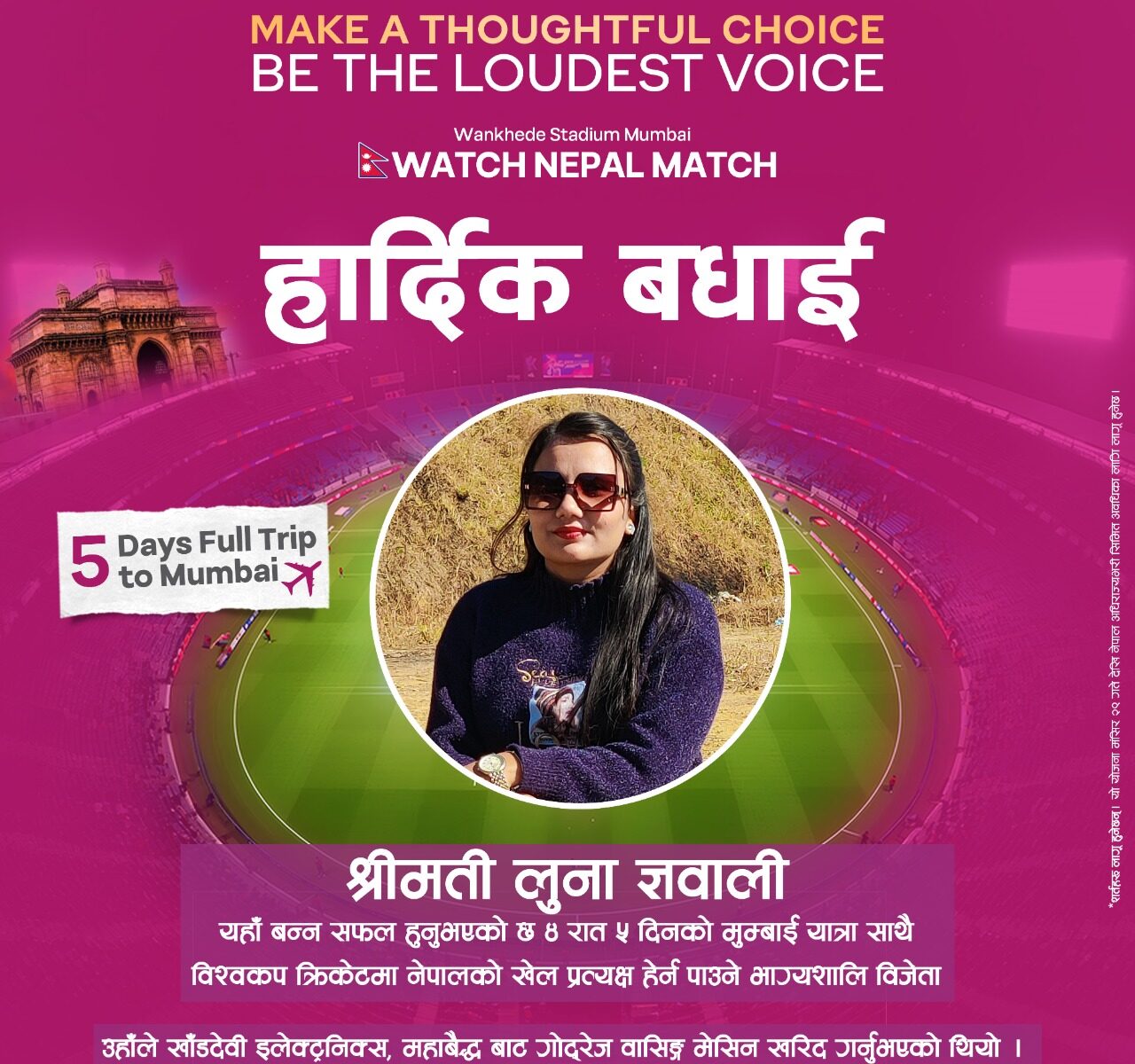 काठमाडौं- गोदरेज नेपालले टी २० विश्वकप अन्तर्गत नेपाल राष्ट्रिय क्रिकेट टोलीको खेल प्रत्यक्ष हेर्न पाउने उपभोक्ता योजनाका विजेता सार्वजनिक गरेको छ । गोदरेजले गत मंसिर २९ गतेदेखि देशभर लागू गरेको यस क्याम्पेनअन्तर्गत पहिलो चरणका विजेता छनोट गरिएको कम्पनीले जनाएको छ । कम्पनीका अनुसार पहिलो चरणको विजेता काठमाडौं टोखा निवासी लुना ज्ञवाली हुन् । उनले खाडादेवी इलेक्ट्रोनिक्स-गोदरेजको […]