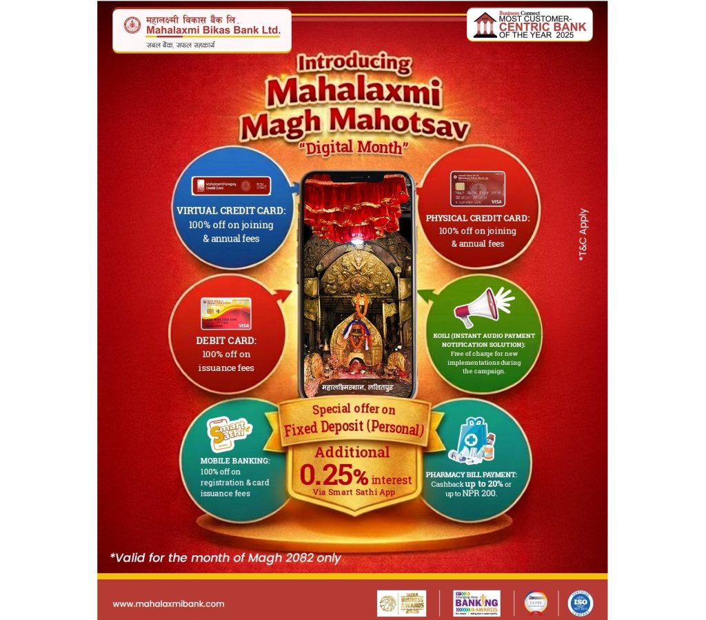 ३० पुस, काठमाडौं । महालक्ष्मी विकास बैंकले डिजिटल कारोबार प्रबर्द्धन, ग्राहक सुविधा अभिवृद्धि तथा नगद रहित बैंकिङ कारोबारलाई बढावा दिन ‘माघ महोत्सव’ डिजिटल प्रबर्द्धन महिना सञ्चालन गर्ने भएको छ ।