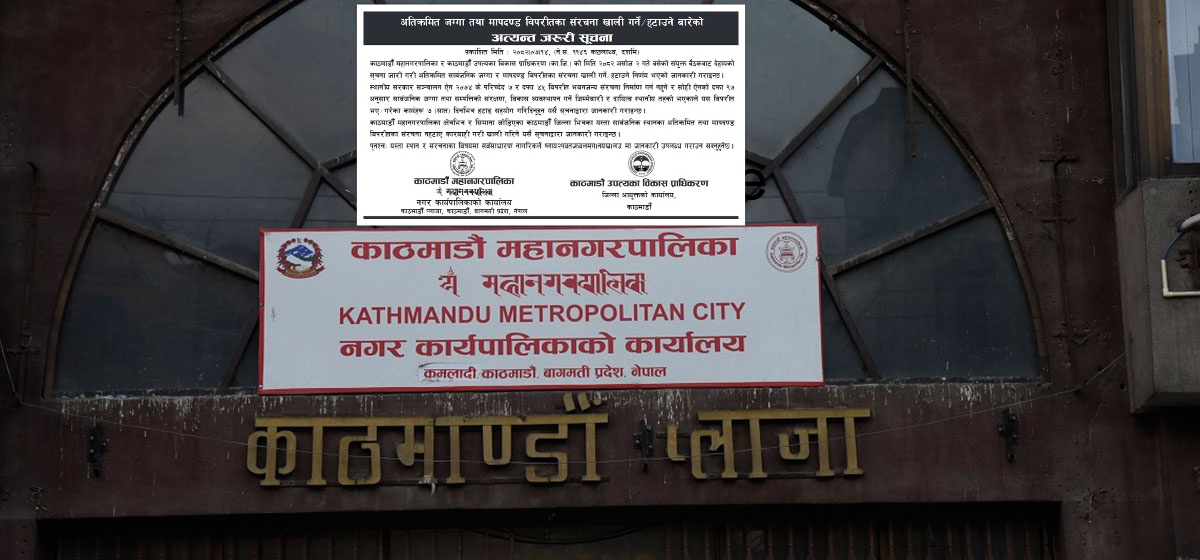 काठमाडौं । काठमाडौं महानगरपालिका (केएमसी) र काठमाडौं उपत्यका विकास प्राधिकरण (केयूडीए) ले संयुक्त रूपमा सात दिनभित्र अतिक्रमित जग्गा र मापदण्ड विपरीतका संरचना हटाउन जारी गरेको निर्देशनको कार्यान्वयन सुस्त बनेको छ। असोज २ गते बसेको दुवै संस्थाको संयुक्त बैठकले गरेको निर्णय अनुसार असोज १७ गते सार्वजनिक सूचना जारी गरी संरचना हटाउने चेतावनी दिइए पनि अझै ठोस […]