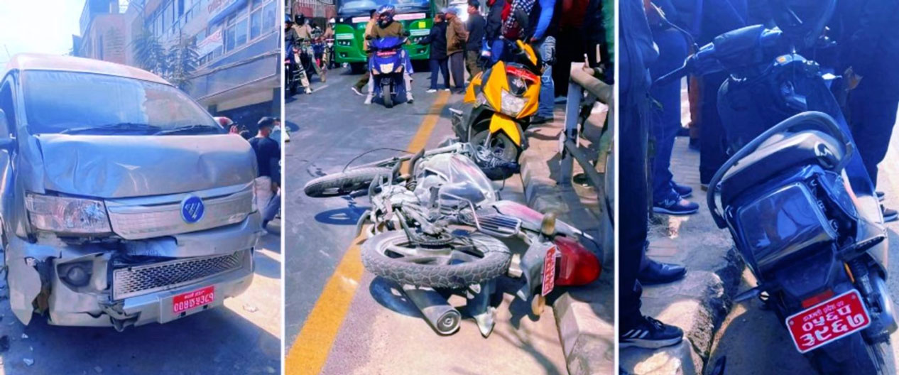 काठमाडौँ। काठमाडौँको जमलस्थित नाचघरनजिकै पाँचवटा सवारीसाधन आपसमा ठोक्किएका छन्। केशरमहलबाट जमलतर्फ जाँदै गरेका र विपरीत दिशाबाट आउँदै गरेका सवारीसाधन जमलस्थित यलो प्यागोडा होटेल अगाडिको सडकमा ठोक्किएर मंगलबार भएको दुर्घटनामा चारजना घाइते भएका छन्। जिल्ला प्रहरी परिसर काठमाडौँका एसपी पवन भट्टराईका अनुसार बा.प्र.०१९०२८ च ४५१२ नम्बरको भ्यान र बा.प्र.०२००५६ प ३९६७ नम्बरको स्कुटर (ईभी) जमलतर्फ जाँदै […]