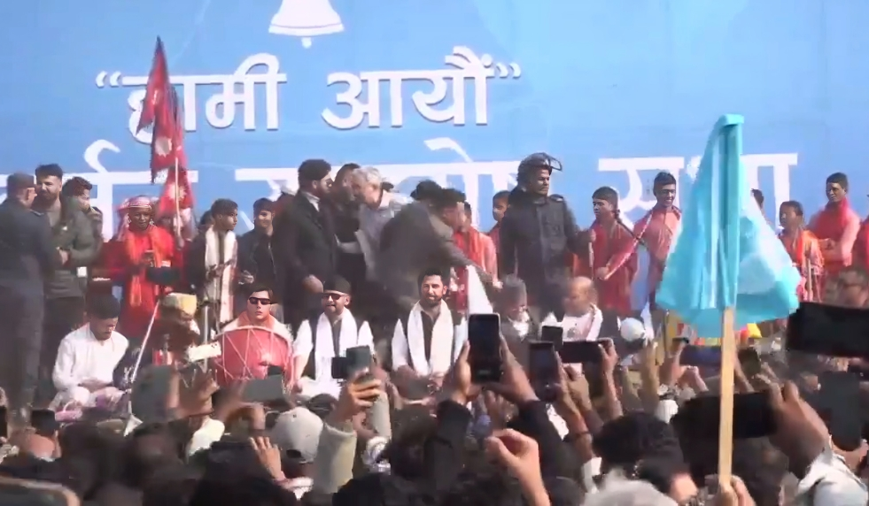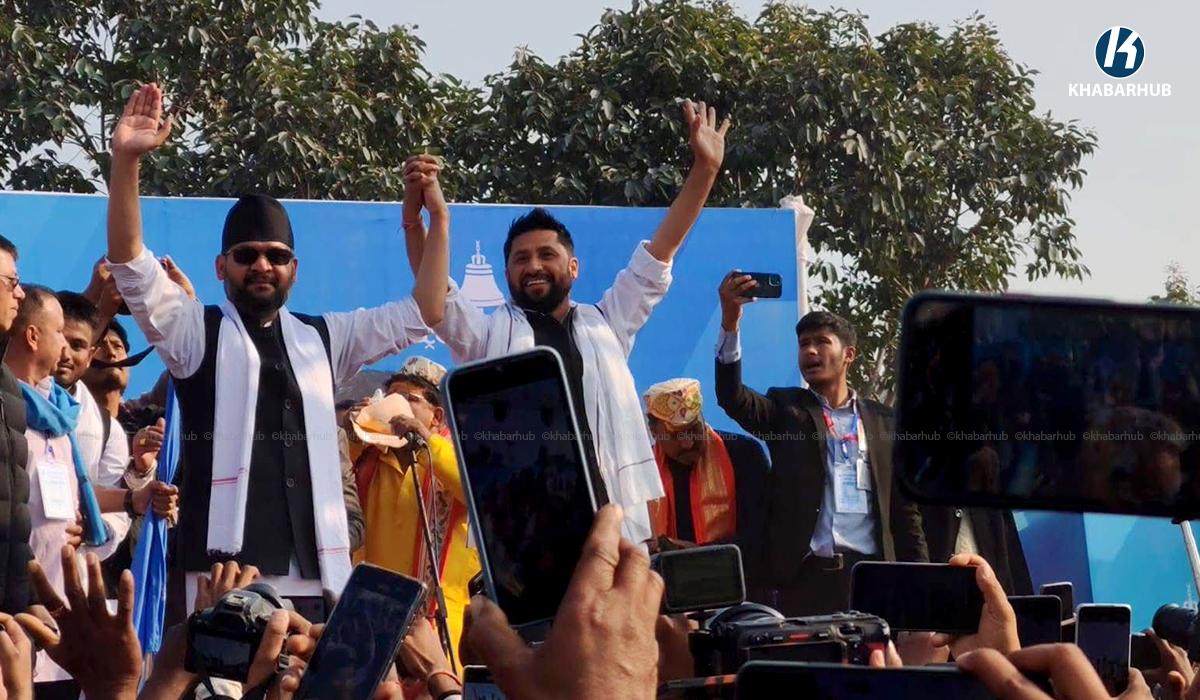 काठमाडौं– मधेस पुगेर राष्ट्रिय स्वतन्त्र पार्टीका सभापति रवि लामिछाने, वरिष्ठ नेता बालेन्द्र शाहलगायतका नेताहरू मञ्चमा पलेटी कसेर बसेका छन् । ठूलो समर्थक र शुभचिन्तकको भिड लागेको जनकपुरधामको सभामा दुई नेतासँगै अन्य नेताहरू पनि पलेटी कसेर स्टेजमा बसेका हुन् । समर्थकहरू स्टेजमै चढ्न थालेपछि ठूलो संख्यामा प्रहरी तैनाथ गरिएको छ ।