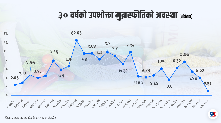 २ पुस, काठमाडौं । नेपालमा उपभोक्ता मूल्यवृद्धि पछिल्लो ५० वर्ष यताकै न्यून बिन्दुमा झरेको छ ।