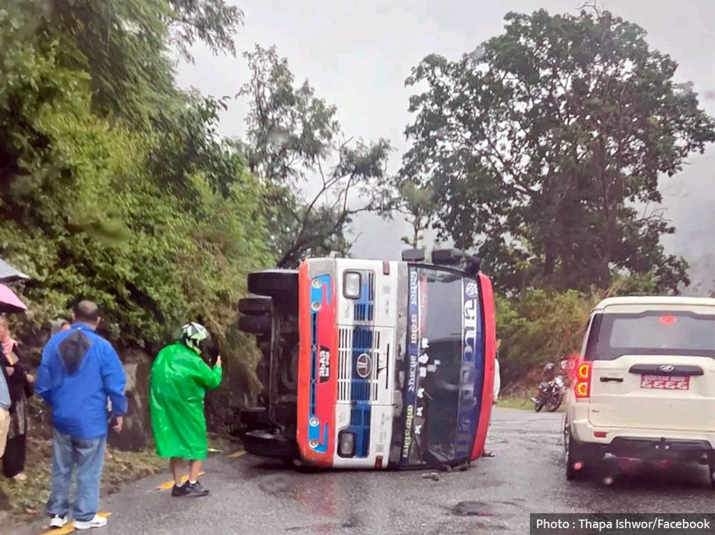 झापाको दमकबाट खोटाङको दिक्तेलतर्फ जाँदै गरेको प्र.१–०२–००१ ख ९५१९ नम्बरको सप्तकोशी यातायातको बस सडक किनारमै पल्टिएको हो ।