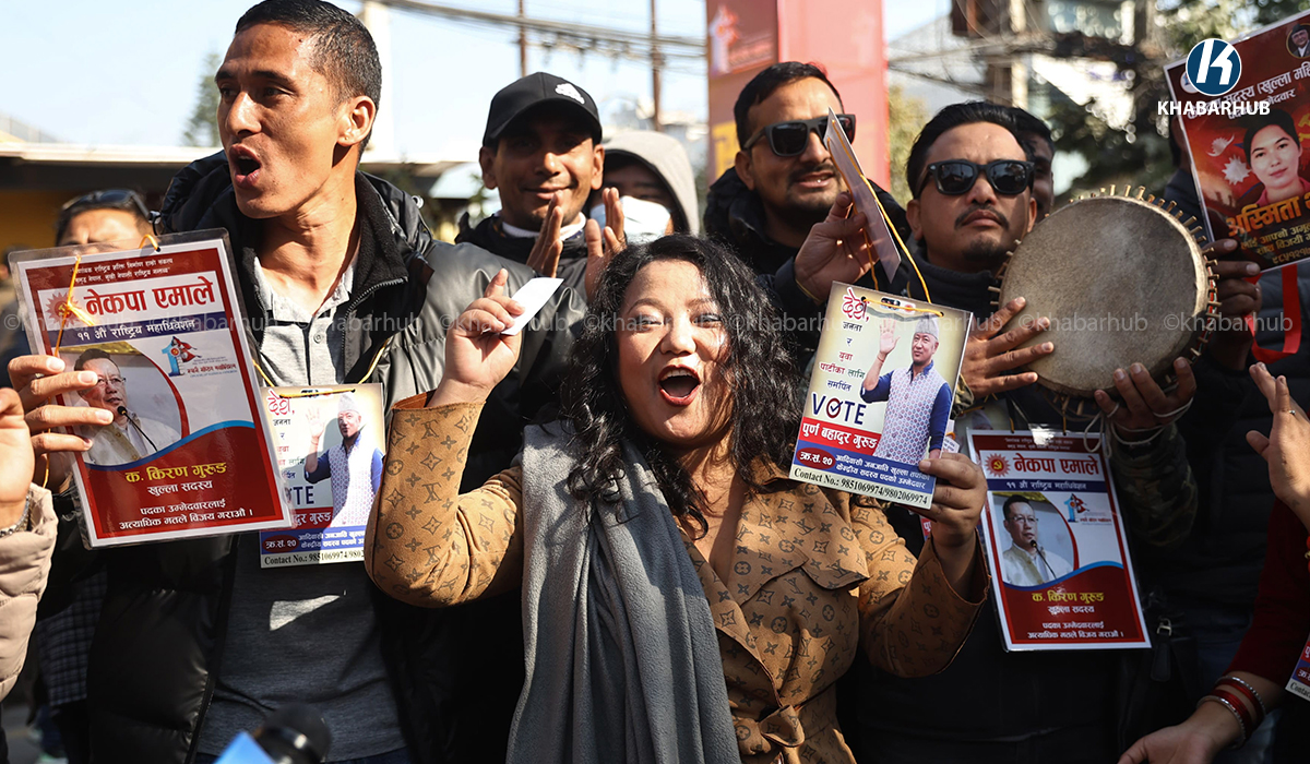 काठमाडौं- नेकपा एमालेको ११औं महाधिवेशनको निर्वाचन कार्यक्रमअनुसार मंगलबार दिउँसो ४ बजेदेखि मतदान प्रक्रिया सुरु हुँदैछ । अहिले नेता, कार्यकर्ता र प्रतिनिधिहरू आफ्नो आफ्नो उम्मेदवारलाई भोट माग्न व्यस्त छन् । जसमा गायिका ज्योति मगर लगायतका कलाकारहरू पनि उपस्थित छन् ।