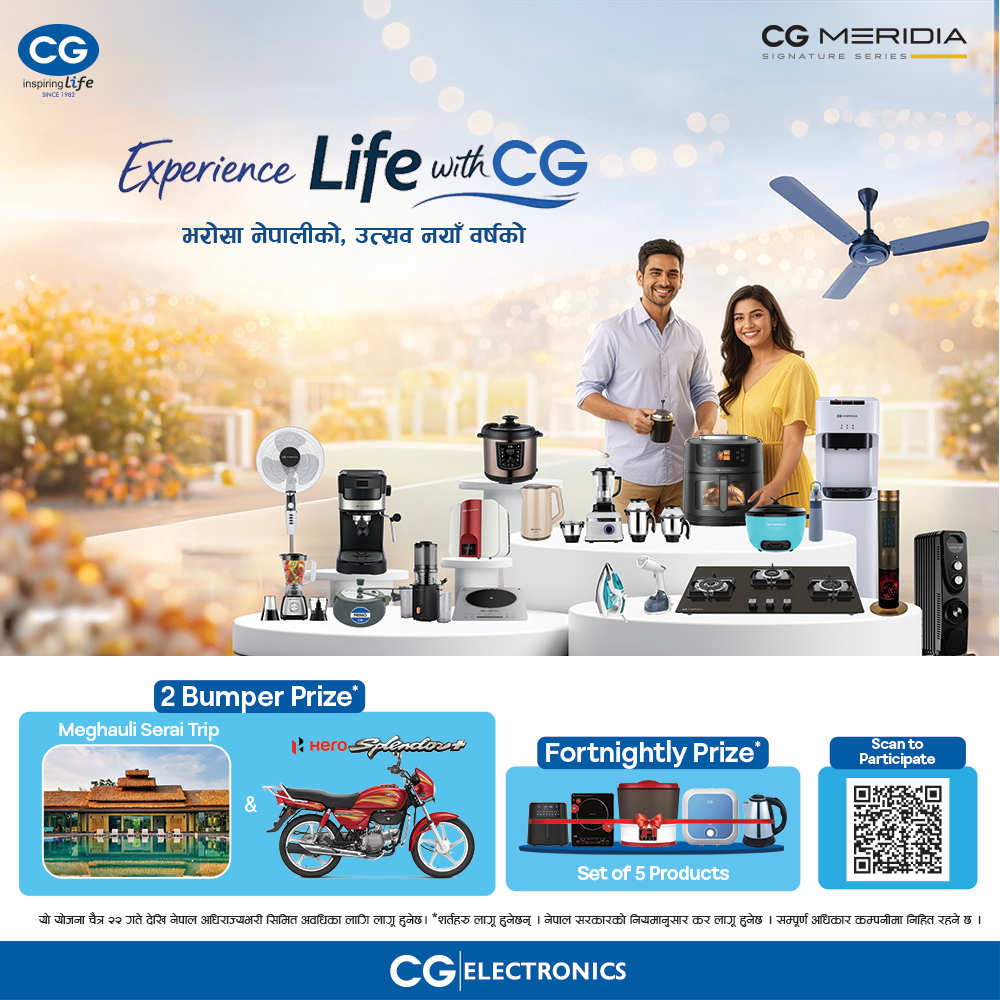 काठमाडौं– इलेक्ट्रोनिक्स ब्रान्ड सीजीले नयाँ वर्ष २०८३ को अवसरमा ‘एक्सपेरियन्स लाइफ उईथ सीजी’: भरोसा नेपालीको, उत्सव नयाँ वर्षको’ अभियान सार्वजनिक गरेको छ । कम्पनीका अनुसार यस योजनाअन्तर्गत ग्राहकलाई सीजी उपकरण खरिद गर्दा प्रत्येक १५ दिनमा ‘सेट अफ ५ प्रोडक्ट्स’ क्यूआर कोड स्क्यान गरी जित्ने अवसर उपलब्ध गराइएको छ । यस अभियानका विजेताले मेघौली सराहीमा लक्जरी स्टे तथा हिरो […]
