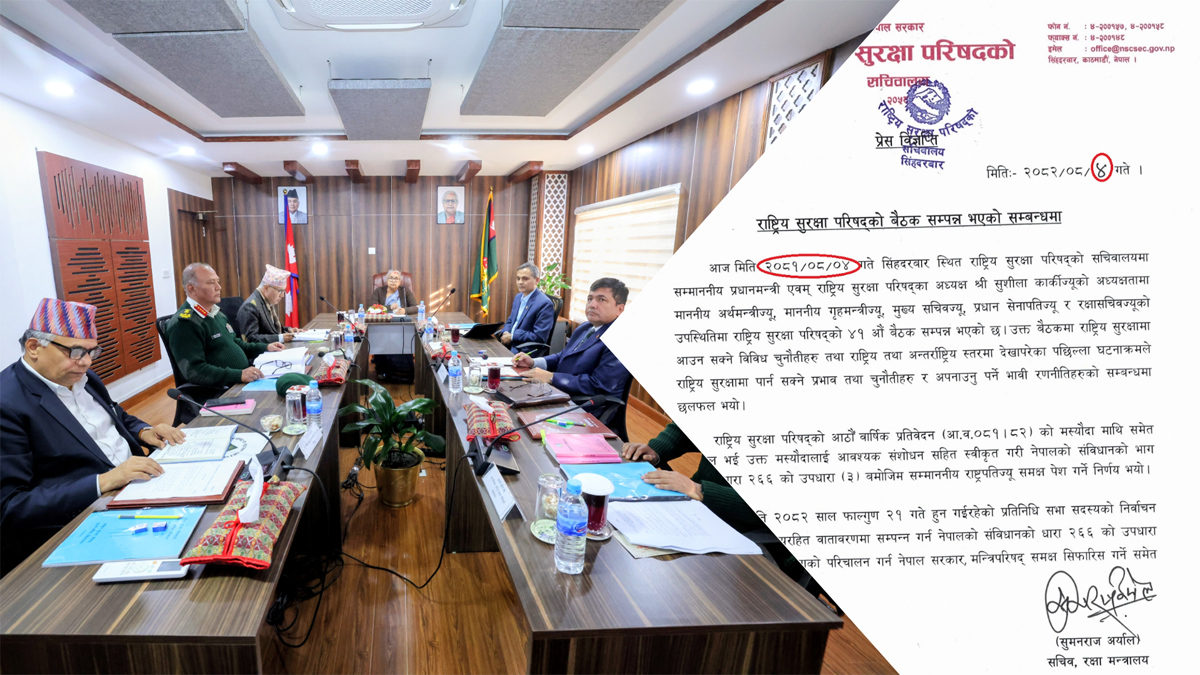 काठमाडौं- राष्ट्रिय सुरक्षा परिषद्को ४१ औं बैठकपछि वक्तव्य निकाल्ने क्रममा गम्भीर गल्ती गरेको पाइएको छ । बाराको सिमरामा तनाव उत्पन्न भएपछि बसेको बैठकले फागुन २१ गते हुने प्रतिनिधि सभा चुनावका अहिले नै मन्त्रिपरिषद्लाई सेना परिचालनको सिफारिस गर्ने निर्णय गरेको छ। तर उक्त बैठकका निर्णयबारे जानकारी सदस्य-सचिव एवम् रक्षा मन्त्रालयका सचिव सुमनराज अर्यालले जारी गरेको वक्तव्यमै […]