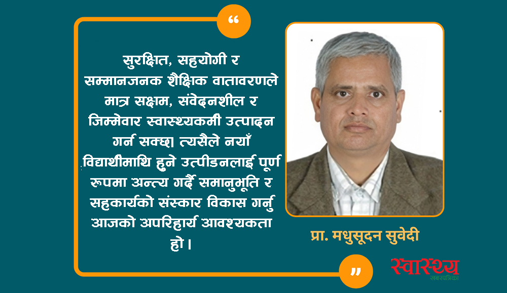 सुरक्षित, सहयोगी र सम्मानजनक शैक्षिक वातावरणले मात्र सक्षम, संवेदनशील र जिम्मेवार स्वास्थ्यकर्मी उत्पादन गर्न सक्छ। त्यसैले नयाँ विद्यार्थीमाथि हुने उत्पीडनलाई पूर्ण रूपमा अन्त्य गर्दै समानुभूति र सहकार्यको संस्कार विकास गर्नु आजको अपरिहार्य आवश्यकता हो।
