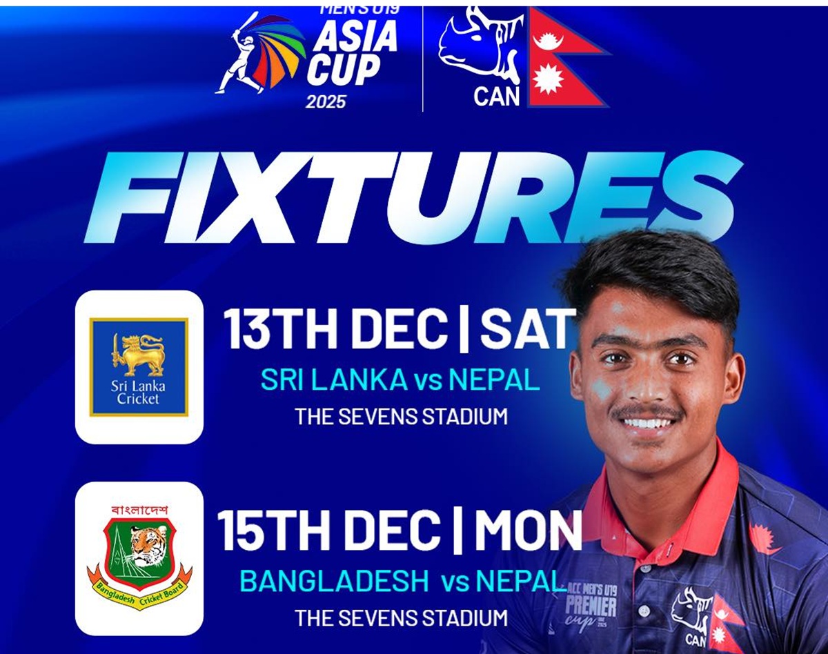 काठमाडौं– १९ वर्षमुनिको पुरुष एसीसी एसिया कप क्रिकेटमा आज नेपाल र श्रीलंकाबीच प्रतिस्पर्धा हुँदैछ । खेल संयुक्त अरब इमिरेट्स (युएई) को दुबईस्थित द सेभेन्स रंगशालामा नेपाली समयअनुसार बिहान पौने ११ बजे सुरु हुनेछ । नेपाल पहिलो खेलमा सुखद सुरुवात गर्ने लक्ष्यका साथ मैदानमा उत्रँदैछ । ८ टोली सहभागी प्रतियोगितामा समूह ‘बी’ बाट नेपाल र श्रीलंकासँगै […]
