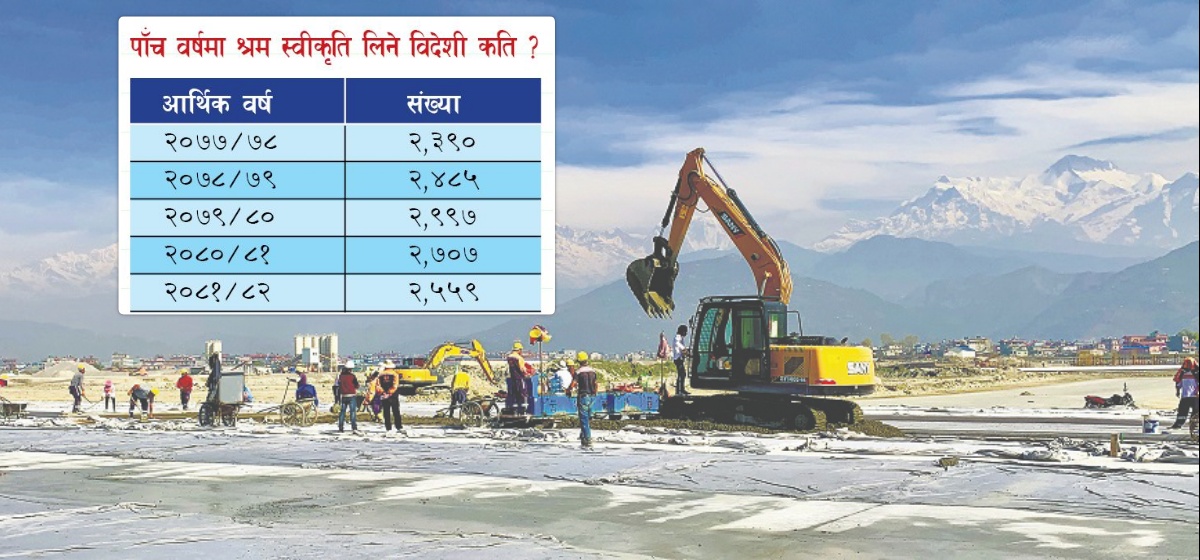 नेपालको जलविद्युत्, सडक, विमानस्थलसहित ठुला पूर्वाधार निर्माणमा चिनियाँ नागरिकले श्रम स्वीकृति लिएका हुन्। चिनियाँ कम्पनीहरूले ठेक्का लिएका स्थानमा चिनियाँ नागरिक कामदारका रूपमा आउने गरेका छन्।