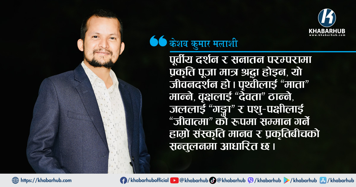 हिन्दुको महान चाड तिहार घरदैलोमा टेकिसकेको छ। प्रकृति, प्रेम र प्रकाशको पर्व, उज्यालो, उत्प्रेरणा र उर्जाको उत्कर्ष , संस्कार सभ्यता र संस्कृतिको संगमका रुपमा परिचित यो उत्सवलाई पंक्तिकारले प्रष्ट्याउन खोजेको छ। प्रकृति नै समष्ट सृष्टिको आधार हो भन्ने मूल मान्यताअनुसार पञ्चतत्वको पूजासँगै देवी देवताहरूको प्रकृतिसँग सम्बन्ध जस्तै इन्द्रलाई वर्षा, वायुदेवलाई हावा, सूर्यलाई प्रकाश र शक्ति, […]