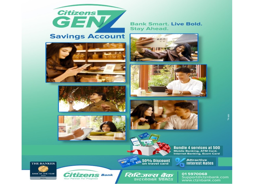 ८ मंसिर, काठमाडौं । सिटिजन्स बैंकले ‘जेन–जी सेभिङ एकाउन्ट’ सञ्चालनमा ल्याएको छ । सोमबार बैंकको कर्पोरेट कार्यालयमा आयोजित एक कार्यक्रममा प्रमुख कार्यकारी अधिकृत गणेशराज पोखरेलले यो खाताको शुभारम्भ गरे ।