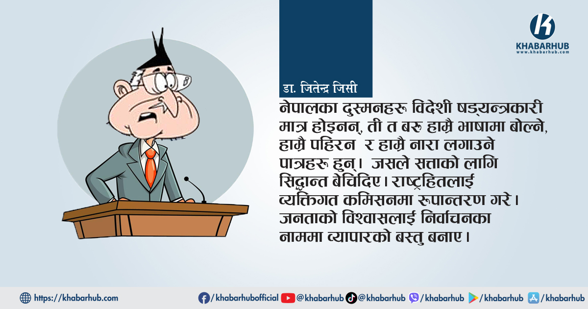 ‘देशको दुस्मन’ सधैँ सीमापारिबाट मात्रै आउँदैन । कहिलेकाहीँ, राष्ट्रका सबैभन्दा खतरनाक दुस्मनहरू त्यही माटोमा हुर्केका, त्यही हावापानीमा सास फेरेका, र त्यहीँका नागरिकहरूकै रूपमा देखा पर्छन् । देशका शत्रुहरूको रूप, चरित्र र पहिचान प्रत्येक राष्ट्रमा फरक–फरक हुन्छ । अमेरिकाका दुस्मनहरू ती हुन्, जसले लोकतान्त्रिक मूल्यहरू भत्काउने षड्यन्त्र गर्छन् । भारतका दुस्मनहरू ती हुन्, जसले सङ्घीय एकता […]