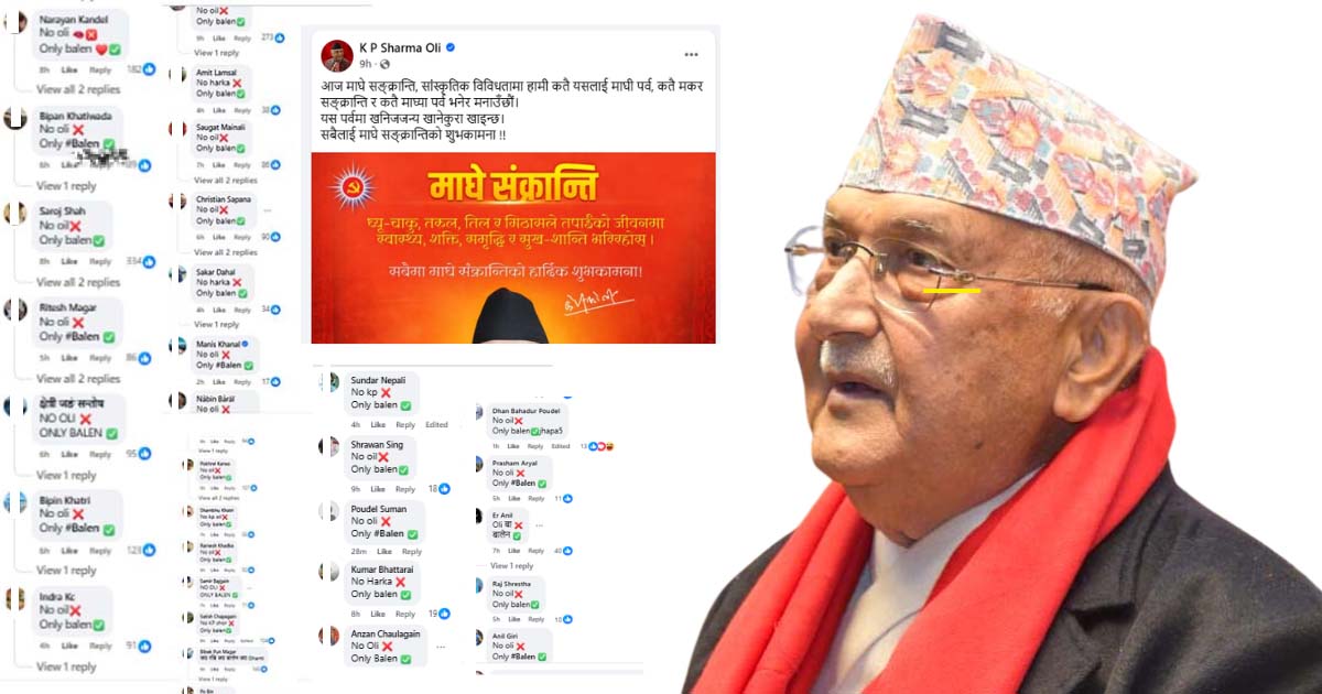 नेकपा एमालेका अध्यक्ष एवं पूर्व प्रधानमन्त्री केपी शर्मा ओलीको आधिकारिक फेसबुक पेजमा पोस्ट गरिएको माघे सङ्क्रान्तिको शुभकामना सन्देशमा काठमाडौं महानगरपालिकाका मेयर बालेन शाहको पक्षमा नारा लगाउँदै कमेन्टको बाढी आएको छ।