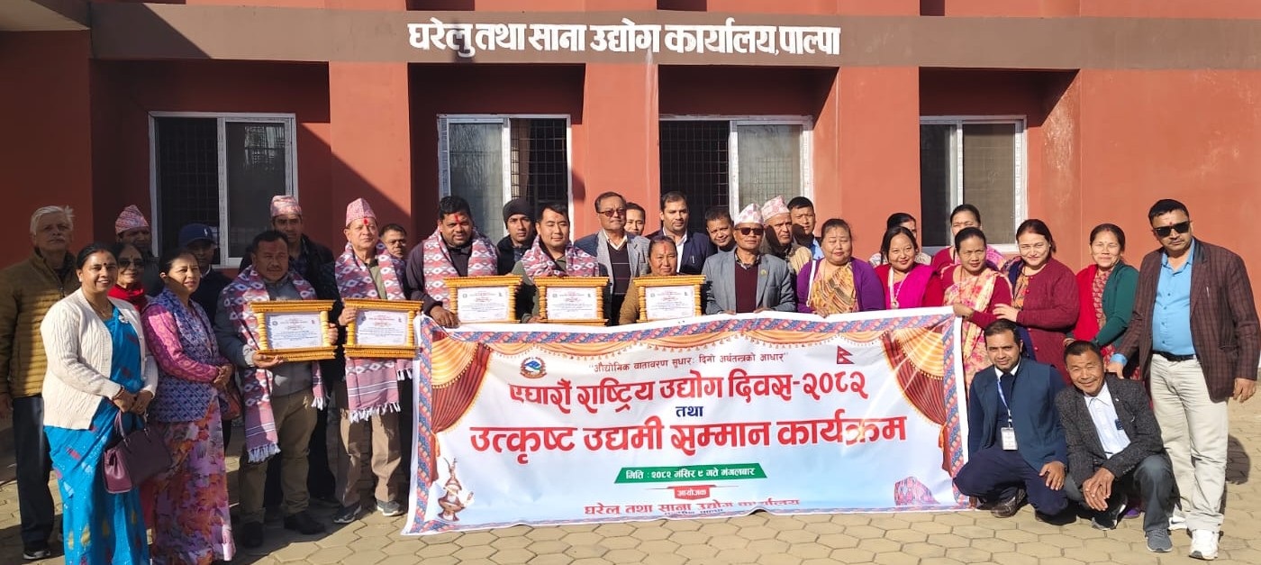 RajdhaniDaily.com | पाल्पा । घरेलु तथा साना उद्योग कार्यालय पाल्पाले जिल्लाका ५ जना उद्यमीहरूलाई उत्कृष्ट उद्यमी सम्मान तथा पुरस्कृत सम्मान गरेको छ । एघारौ राष्ट्रिय उद्योग -