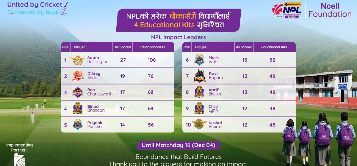 काठमाडौं– एनसेल फाउन्डेसनले बिहीबारसम्म खेलिएका नेपाल प्रिमियर लिग (एनपीएल) सिजन २ का खेलहरुमा हानिएका चौकाहरू बापत दुई हजार भन्दा बढी शैक्षिक सामग्री वितरण गर्ने भएको छ । कम्पनीका अनुसार क्रिकेटलाई कक्षाकोठासँग र हरेक चौकालाई उज्ज्वल भविष्यसँग जोड्ने सामाजिक पहलअनुसार, यी सामग्रीहरू सरकारी तथा सामुदायिक विद्यालयमा अध्ययनरत विद्यार्थीहरूलाई प्रदान गरिनेछन् । गत वर्ष एनपीएलसँगको सहकार्यमा सुरु गरिएको […]