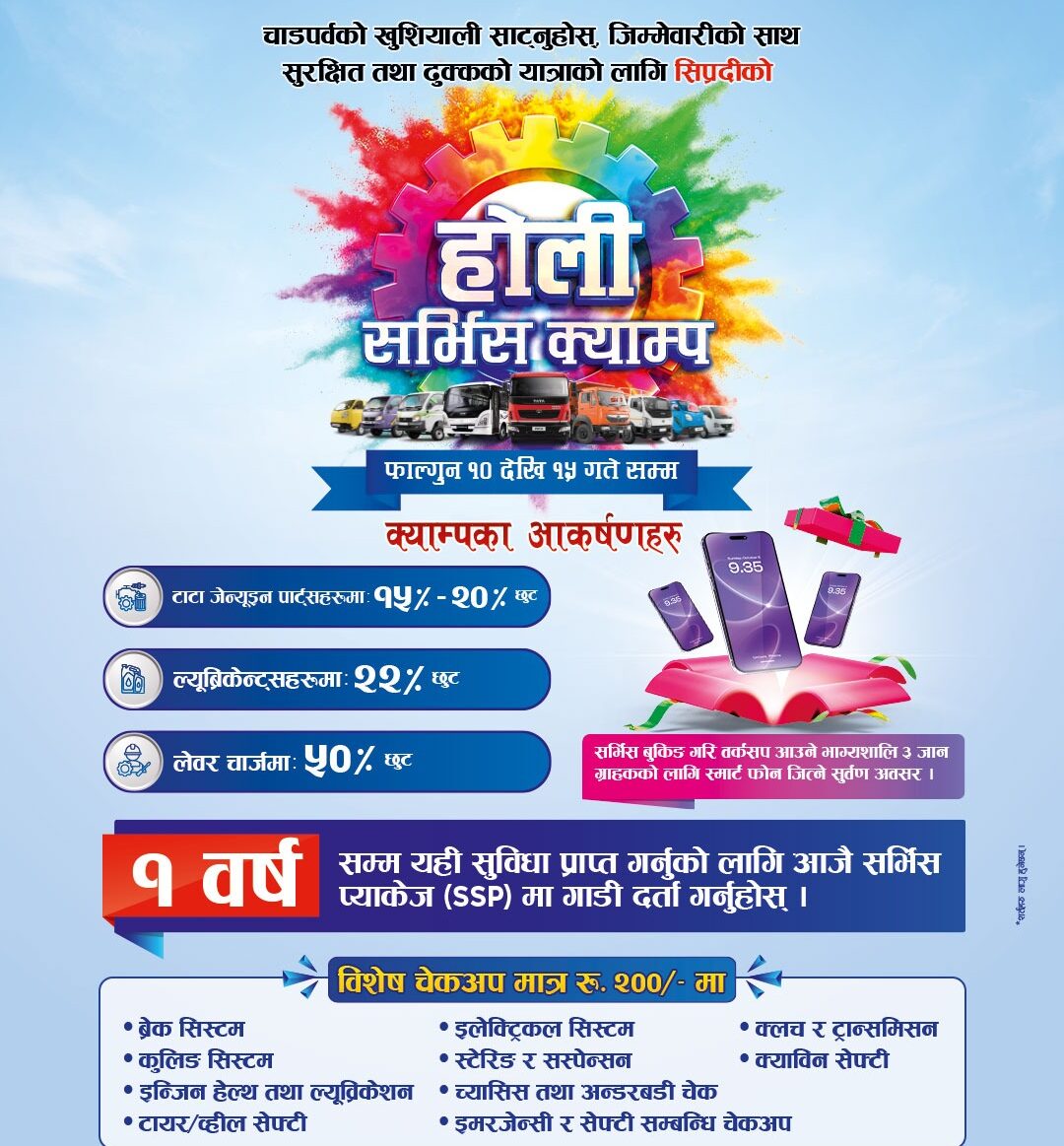 काठमाडौं– होली पर्व नजिकिँदै गर्दा टाटा कमर्सियलले ग्राहकलाई आजदेखि १५ गते सम्मका लागि होली सर्भिस क्याम्पको आयोजना गरेको छ । उक्त क्याम्प सिप्रदीका २० वटा सर्भिस सेन्टरहरुमा एकै साथ संचालन हुनेछ । कम्पनीका अनुसार उक्त क्याम्पमा सहभागी ग्राहकका गाडीहरूको सुरक्षित यात्राको सुनिश्चितता प्रदान गर्नका लागि विशेष १० वटा प्वाइन्टहरु १.ब्रेक सिस्टम २.कुलिङ सिस्टम ३.इन्जिन हेल्थ तथा ल्यूव्रिकेशन […]