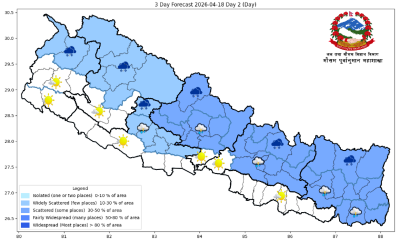 आज कोशी प्रदेशलगायत बागमती र गण्डकी प्रदेशको पहाडी र हिमाली भू–भागमा साधारणतया बादल लाग्ने, मधेश प्रदेशलगायत बाँकी पहाडी र हिमाली भू–भागमा आंशिक बादल लाग्ने र बाँकी तराई भू–भागमा मौसम मुख्यतया सफा रहनेछ । जल तथा मौसम पूर्वानुमान महाशाखाका अनुसार कोशी प्रदेशलगायत बागमती र गण्डकी प्रदेशका हिमाली र पहाडी भू–भागका थोरै स्थानहरुमा तथा लुम्बिनी प्रदेशको पहाडी […]
