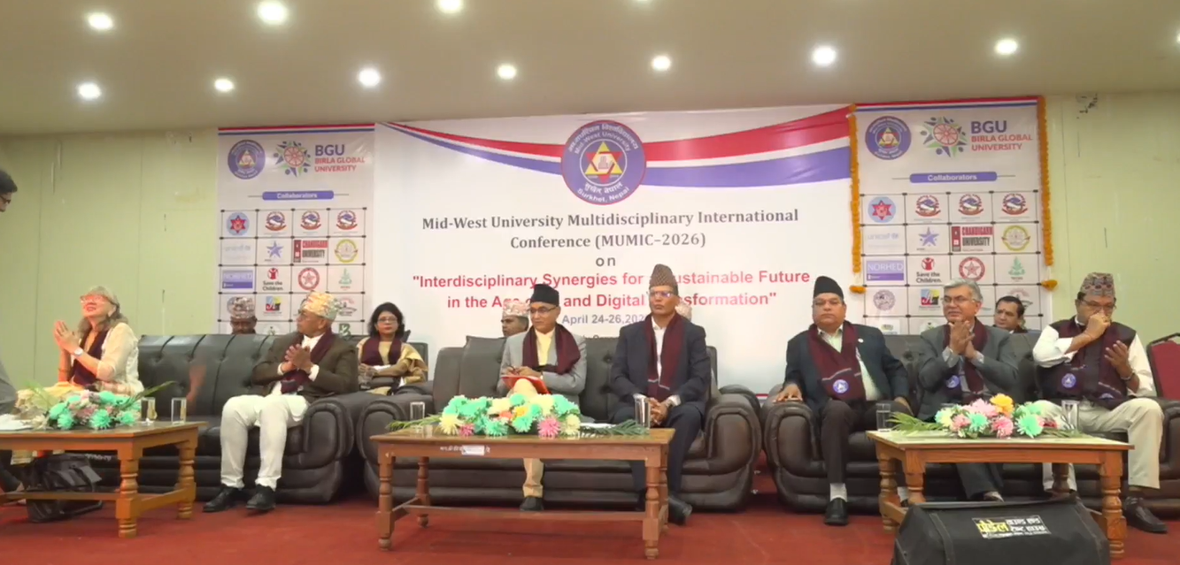 कर्णाली– कर्णाली प्रदेशको राजधानी सुर्खेत वीरेन्द्रनगरस्थत मध्यपश्चिम विश्वविद्यालयमा ‘बहुविषयगत अन्तर्राष्ट्रिय सम्मेलन–२०२६’ उद्घाटन भएको छ । भारतको बिरला ग्लोबल युनिभर्सिटीसँगको सहकार्यमा मध्यपश्चिम विश्वविद्यालयद्वारा आयोजित ‘बहुविषयगत अन्तर्राष्ट्रिय सम्मेलन’ (मल्टिडिस्प्लिनियरी इन्टरनेश्नल कन्फेरेन्स)को उद्घाटन आज कर्णाली प्रदेश सरकारका मुख्यमन्त्री यामलाल कँडेलले गरेका हुन् । सम्मेलनको उद्घाटन गर्दै मुख्यमन्त्री कँडेलले विश्वविद्यालयले शैक्षिक कार्यक्रमसँगै आफूलाई राष्ट्रिय र अन्तरराष्ट्रियस्तरमा स्थापित गर्न नवीनतम […]