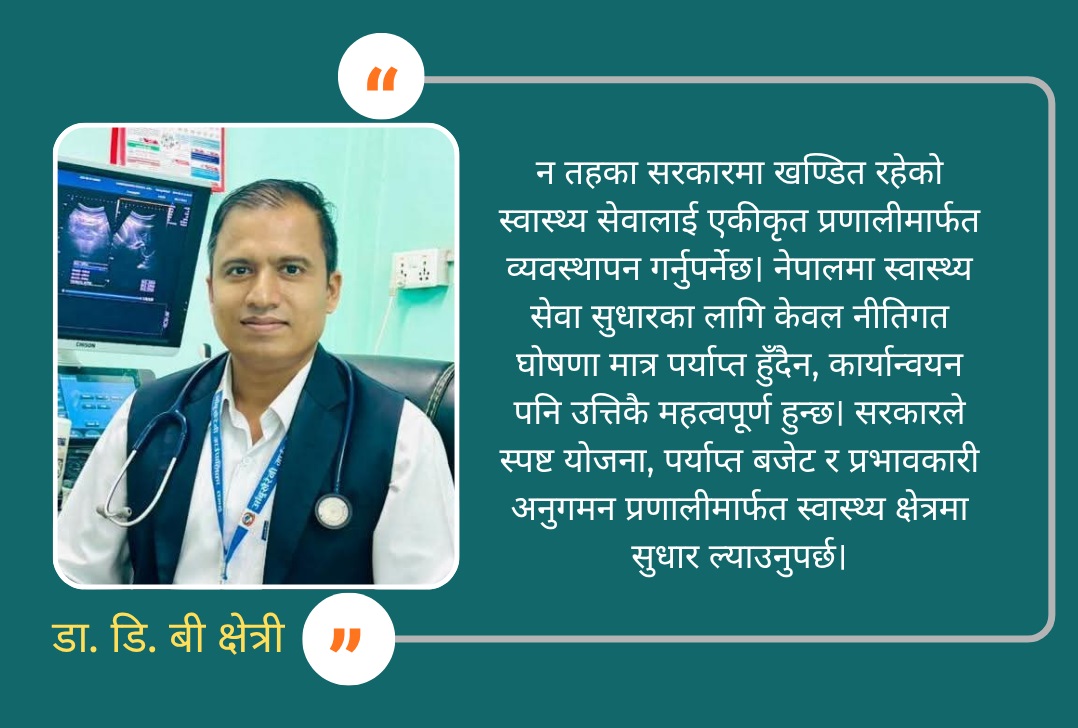 नेपालमा चिकित्सक र स्वास्थ्यकर्मीको दरबन्दी अत्यन्त कम छ। पछिल्लो तथ्यांक अनुसार नेपालमा २६ हजार स्वास्थ्यकर्मी स्थानीय तहमा, ३५ सय प्रदेश सरकारमा र २६ सय केन्द्रमा गरी कुल ३२ हजार १ सय स्वास्थ्यकर्मी छन्। स्वास्थ्य क्षेत्रमा २०४६ साल आसपासको पुरानो दरबन्दीमै काम भइरहेको छ। करार र ज्यालादारीका कर्मचारीको भरमा धेरै स्वास्थ्य संस्था सञ्चालनमा छन्।