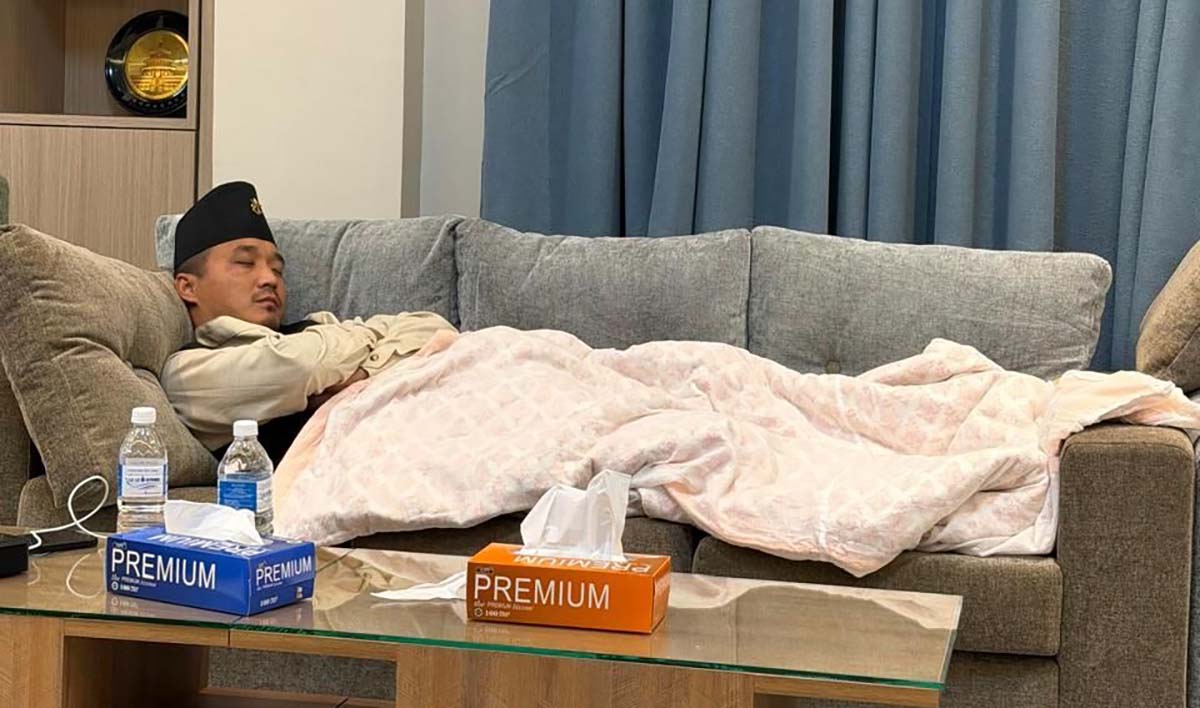 काठमाडौँ – निरन्तर काममा खटेका गृहमन्त्री सुधन गुरुङ मन्त्रालयमै आराम गरिरहेको तस्बिर सार्वजनिक भएको छ । कार्यव्यस्तताका कारण घर जान नपाएपछि उनी मन्त्रालयकै सोफामा सुतेका हुन् । उनको निजी सचिवालयका अनुसार २४ घण्टा काममा व्यस्त मन्त्री गुरुङ मन्त्रालयमै सुतेका हुन् ।