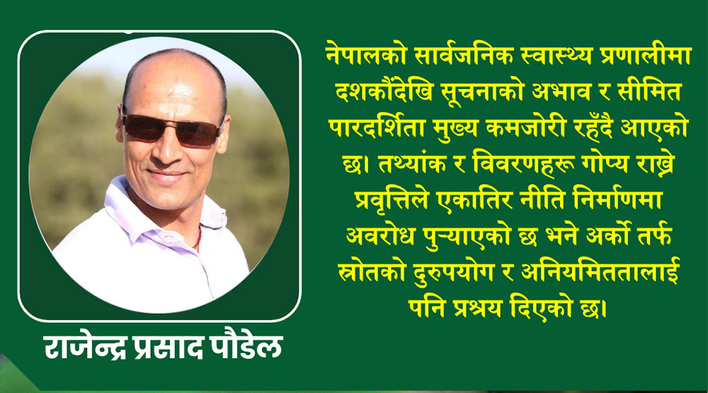 नेपालको सार्वजनिक स्वास्थ्य प्रणालीमा दशकौंदेखि सूचनाको अभाव र सीमित पारदर्शिता मुख्य कमजोरी रहँदै आएको छ। तथ्यांक र विवरणहरू गोप्य राख्ने प्रवृत्तिले एकातिर नीति निर्माणमा अवरोध पुर्याएको छ भने अर्को तर्फ स्रोतको दुरुपयोग र अनियमिततालाई पनि प्रश्रय दिएको छ।
