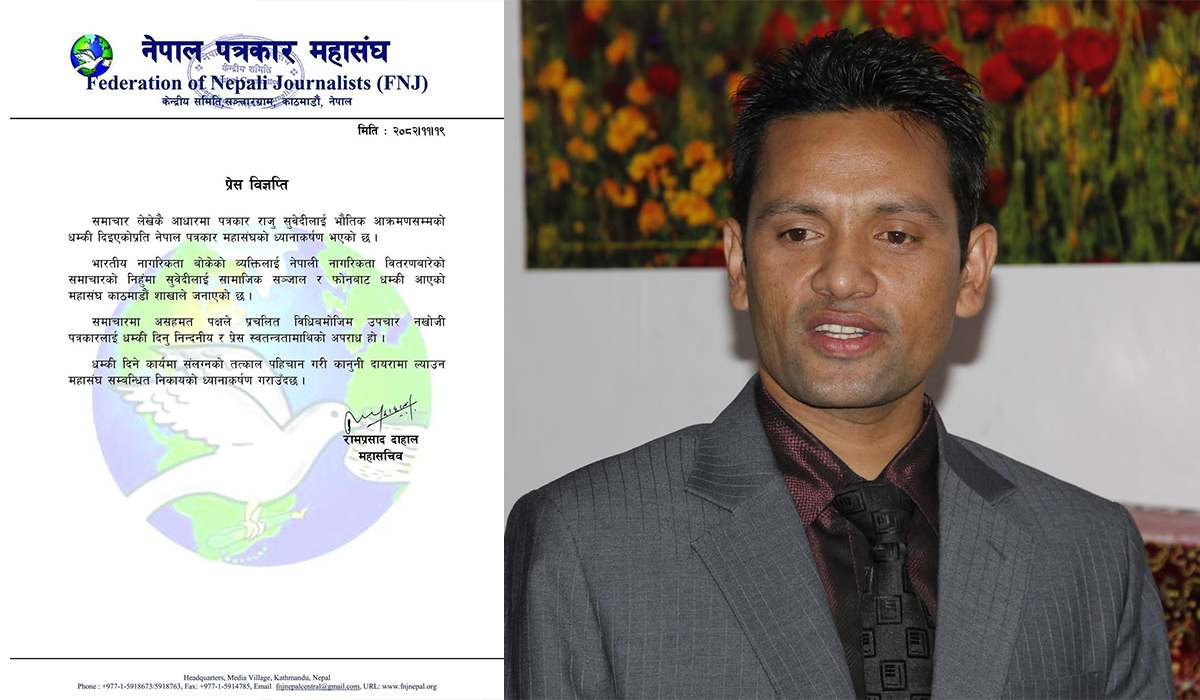 काठमाडौं – नेपाल पत्रकार महासंघले समाचार लेखेकै आधारमा पत्रकार राजु सुवेदीलाई भौतिक आक्रमणसम्मको धम्की दिइएको घटनाप्रति गम्भीर ध्यानाकर्षण भएको जनाएको छ । महासंघले जारी गरेको प्रेस विज्ञप्तिमा भारतीय नागरिकता बोकेको व्यक्तिलाई नेपाली नागरिकता वितरणसम्बन्धी समाचार प्रकाशित भएपछि सुवेदीलाई सामाजिक सञ्जाल र फोनमार्फत धम्की आएको उल्लेख गरिएको छ। पत्रकार राजु सुवेदीले बागलुङमा सार्वजनिक जग्गा अतिक्रमण गर्दा […]