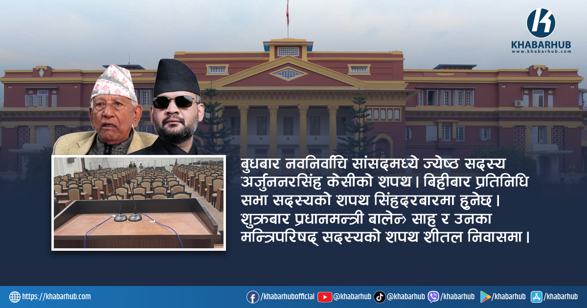 काठमाडौँ – सरकारले चैत १२ गते दिउँसो २ बजे नवनिर्वाचित प्रतिनिधि सभा सदस्यको पद तथा गोपनीयताको शपथ कार्यक्रम तय गरेको छ। सिंहदरबारस्थित निर्माणाधीन संघीय संसद् भवनमा ज्येष्ठ सदस्यले अन्यलाई शपथ गराउने छन्।र संघीय संसद् सचिवालयले नेपाली कांग्रेसका समानुपातिकतर्फका सांसद अर्जुननरसिंह केसीले शपथ गराउँदै तयारी गरेको छ। त्यस अगाडि केसीले बुधबार राष्ट्रपति रामचन्द्र पौडेलबाट राष्ट्रपति निवासमा […]