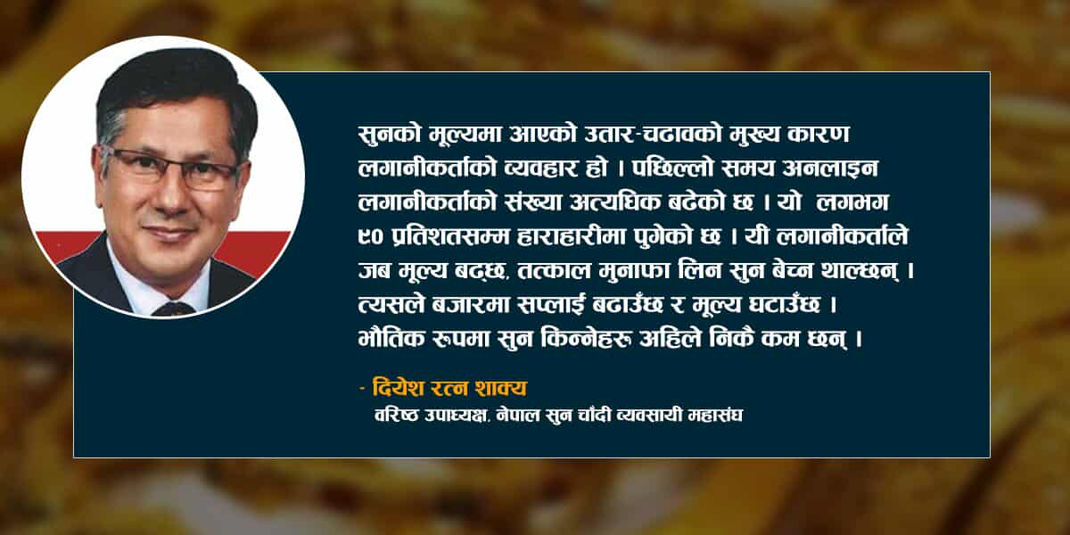 नेपालको सुन बजार पछिल्ला दिनहरूमा निकै अस्थिर बन्दै गएको छ । कहिले मूल्य आकासिन्छ, कहिले ह्वात्तै घट्छ यिनै विषयमा हामीले नेपाल सुनचाँदी व्यवसायी महासंघका वरिष्ठ उपाध्यक्ष दियेश रत्न शाक्यसँग कुराकानी गरेका छौँ। उनले सुन बजारको हालको स्थिति, कर नीतिको असर र सरकारसँगका अपेक्षाबारे खुलस्त कुरा गरेका छन् । सुन बजारमा उतार चढाव आउनुको कारण के […]