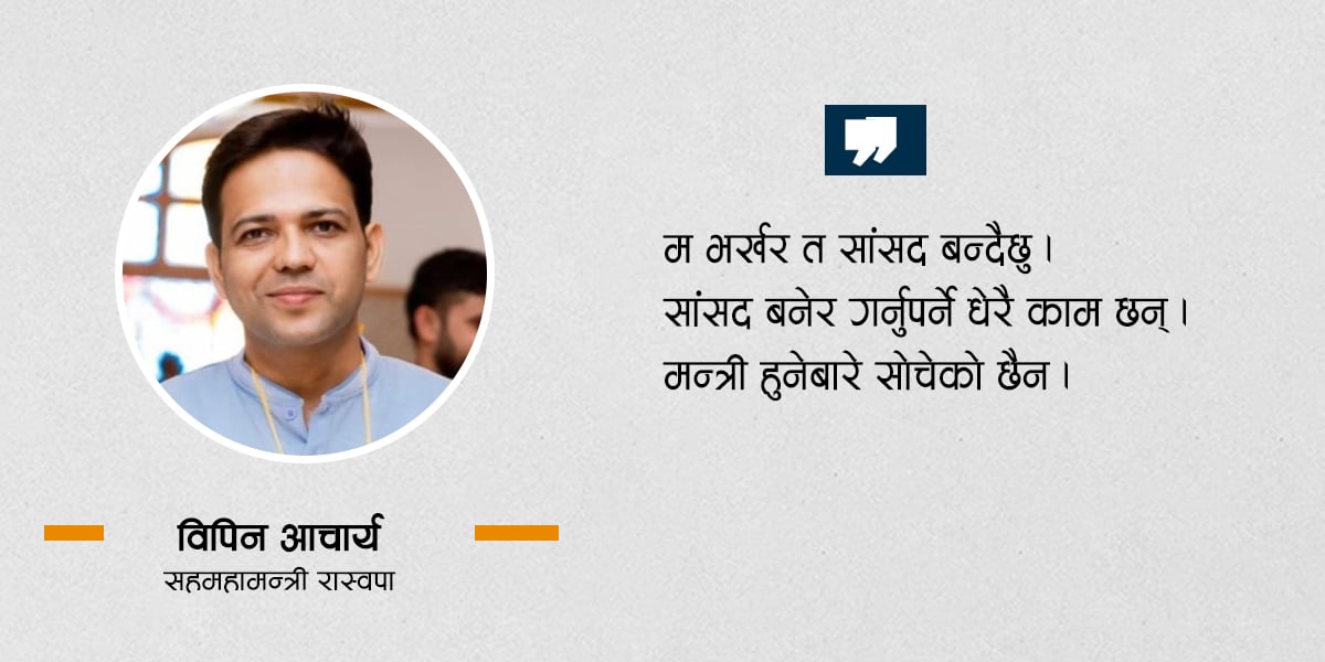 काठमाडौं- विपिन आचार्य स्थापनाकालदेखि नै राष्ट्रिय स्वतन्त्र पार्टीमा आबद्ध छन् । पार्टीको व्यवस्थापन पक्ष सम्हाल्दै आएका उनले २०७९ को निर्वाचनमा प्रत्यक्ष लडेनन्, समानुपातिकमा पनि परेनन् । ०८२ मा भने उनलाई पार्टीले समानुपातिकको खस आर्यतर्फ पहिलो नम्बरमा राखेको थियो । तर उनले उम्मेदवारी फिर्ता गरेर दाङ-२ बाट प्रत्यक्ष चुनाव लडे । उनले नेकपा एमालेका महासचिव शंकर […]