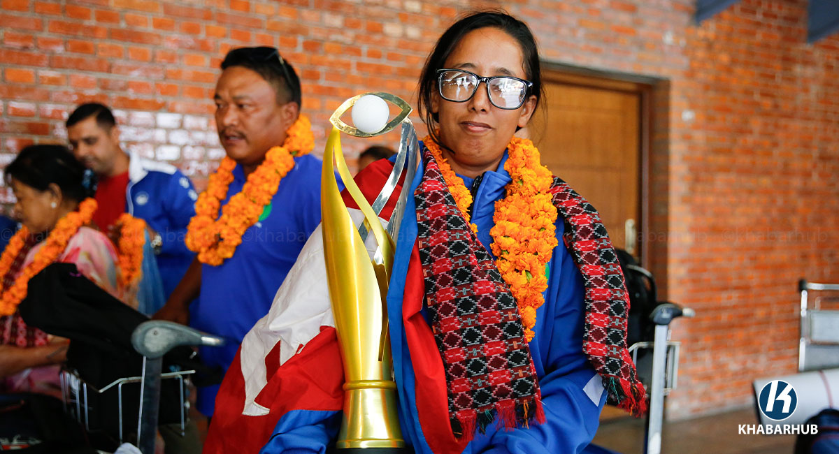 काठमाडौं– नेत्रहीन महिला टी–२० विश्वकप क्रिकेट २०२५ की उप–विजेता नेपाली टोलीको त्रिभुवन अन्तर्राष्ट्रिय विमानस्थलमा स्वागत गरिएको छ । श्रीलंकाको कोलम्बोमा भएको ‘पहिलो दृष्टिविहीन महिला टी-२० विश्वकप क्रिकेट २०२५’ को फाइनलमा नेपाल भारतसँग पराजित भएको थियो । तस्बिर : नेपाल फोटो लाइब्रेरी ।