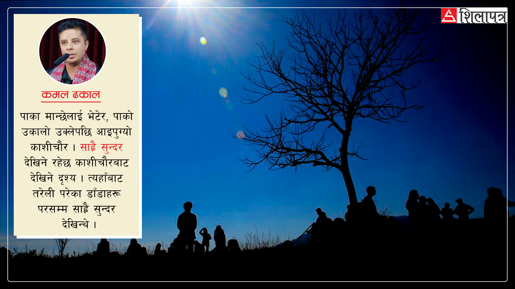 पाका मान्छेलाई भेटेर, पाको उकालो उक्लेपछि आइपुग्यो काशीचौर । साह्रै सुन्दर देखिने रहेछ काशीचौरबाट देखिने दृश्य । त्यहाँबाट तरेली परेका डाँडाहरू परसम्म साह्रै सुन्दर देखिन्थे । डाँडामाथि भएको त्यो चौर साह्रै सुन्दर थियो ।