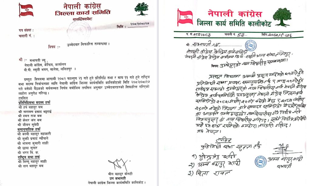२८ मंसिर, काठमाडौं । नेपाली कांग्रेस कालीकोटमा प्रतिनिधि उम्मेदवार सिफारिसमा विवाद भएको छ । सभापति अम्बबहादु शाही र उपसभापति मीनबहादुर बोगटी समूहबीच सहमति नहुँदा छुट्टाछुट्टै नाम सिफारिस गरिएको छ ।