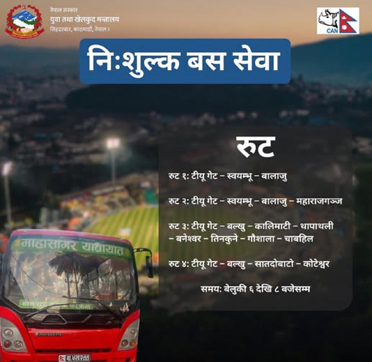 काठमाडौं– एनपीएल हेरेर राति घर फर्कन कठिनाइ भएका दर्शकका लागि निःशुल्क बस सेवा सुरु हुने भएको छ। युवा तथा खेलकुद मन्त्रालय र नेपाल क्रिकेट संघको पहलमा निःशुल्क बस सेवा सुरु हुन लागेको मन्त्री बब्लु गुप्ताले बताएका छन् । मन्त्री गुप्ताले सामाजिक सञ्जाल फेसबुकमार्फत यस्तो जानकारी दिएका हुन् । चिसो मौसम र सवारी साधनको अभावले विशेष […]