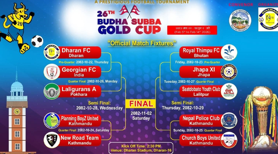 ७ माघ, काठमाडौं । २६औं बुढासुब्बा गोल्डकप फुटबल २०८२ को खेलतालिका सार्वजनिक भएको छ ।