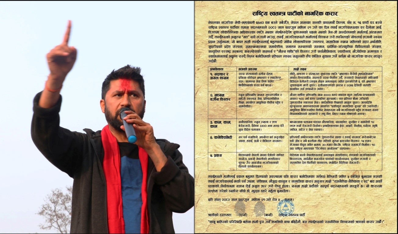 राष्ट्रिय स्वतन्त्र पार्टी (रास्वपा) ले ७ फागुनमा नागरिक करारको नाममा घोषणापत्र जारी गर्ने भएको छ । २१ फागुनमा हुने निर्वाचनका लागि रास्वपाले मुख्य गरी सुशासनलाई प्राथमिकता दिँदै चुनावमा नागरिक करार ल्याउन लागेको हो ।