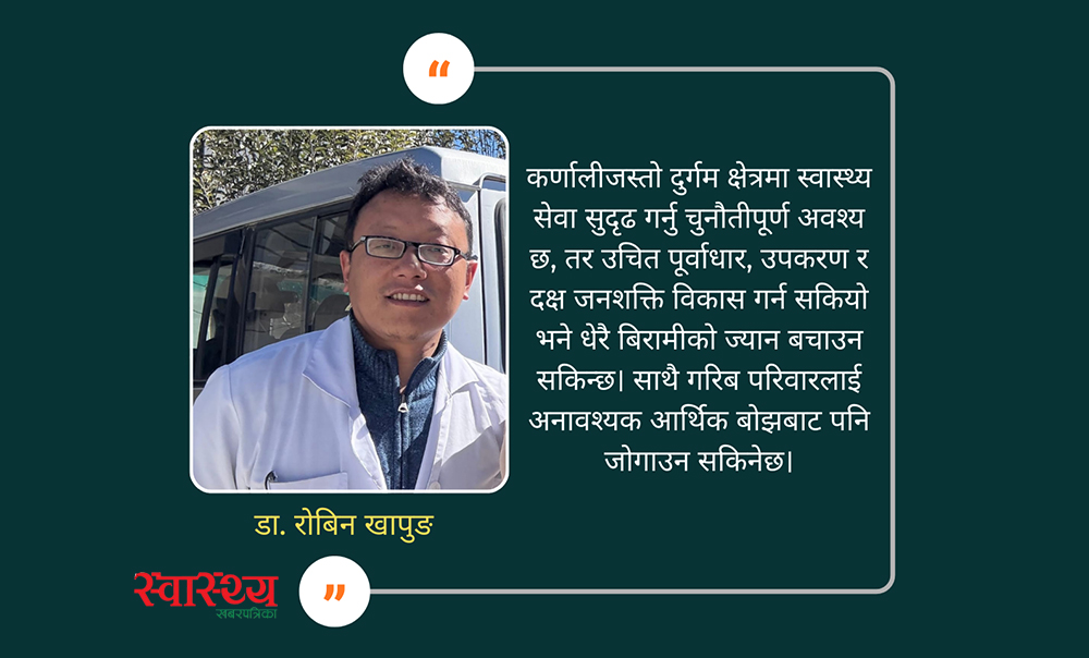 कर्णालीजस्तो दुर्गम क्षेत्रमा स्वास्थ्य सेवा सुदृढ गर्नु चुनौतीपूर्ण अवश्य छ, तर उचित पूर्वाधार, उपकरण र दक्ष जनशक्ति विकास गर्न सकियो भने धेरै बिरामीको ज्यान बचाउन सकिन्छ। साथै गरिब परिवारलाई अनावश्यक आर्थिक बोझबाट पनि जोगाउन सकिनेछ।