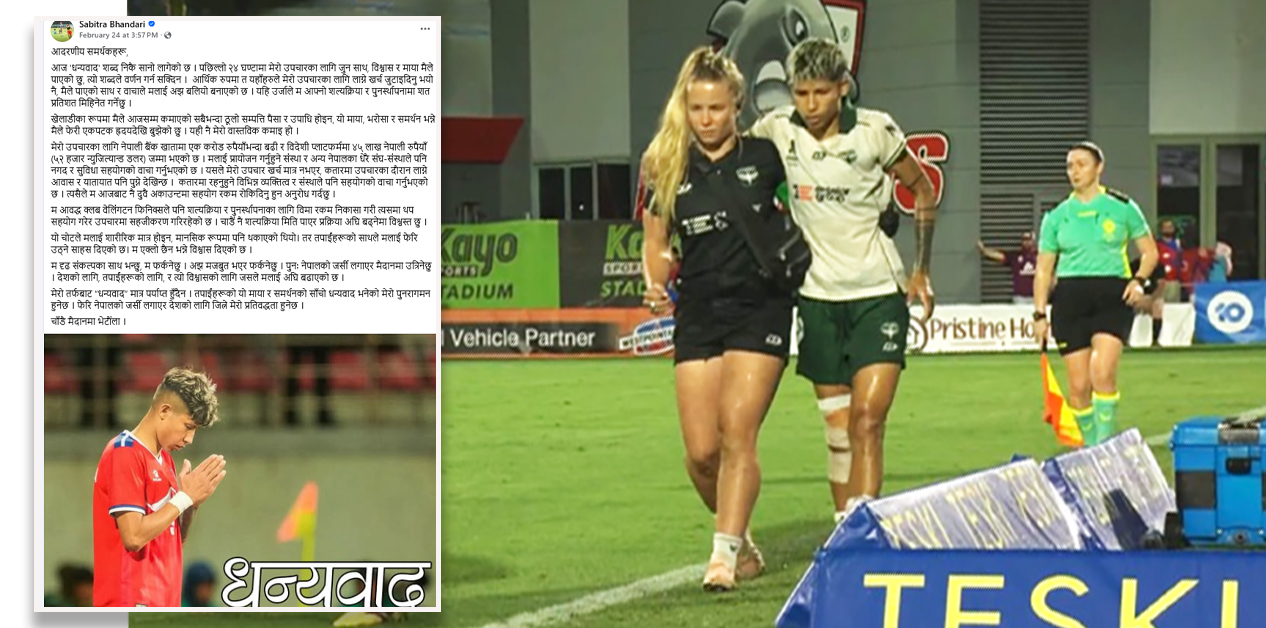नमस्कार, म सावित्रा भण्डारी, तपाईंहरूकी ‘साम्बा’। यहाँहरू सबैलाई थाहा नै छ– म पछिल्लो सात हप्तादेखि चोटका कारण मैदानबाहिर छु। सोचेजस्तो हुन्थ्यो भने अहिले चोटको शल्यक्रिया गरेर फिजियो सुरु गरेको केही समय बितिसक्ने थियो। तर, अझै पनि म उपचारका लागि भौँतारिएकी छु। मेरा घुँडाको एसीएलमा यसअघि शल्यक्रिया गरेर हालिएको ग्राफ्ट र एमसीएल दुवैमा गम्भीर चोट लागेको […]