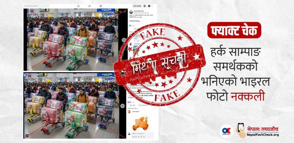फागुन २१ गते हुने प्रतिनिधिसभा सदस्य निर्वाचनको लागि सुनसरी क्षेत्र नं. १ का उम्मेदवार हर्क साम्पाङको फोटो टाँसिएको लगेजका साथ मलेसियाबाट नेपालीहरु फर्कँदै गरेको दावीसहित एउटा फोटो सामाजिक सञ्जालमा फैलिएको छ।