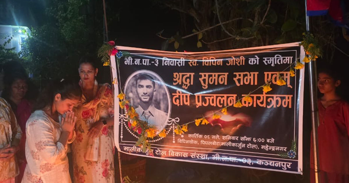 महेन्द्रनगर – इजरायल–हमास युद्धमा हमासको अपहरणमा परी ज्यान गुमाएका विपिन जोशीको सम्झनामा ‘विपिन चोक’ नामकरण गरिएको छ । आज साँझ एक कार्यक्रमका बीच यहाँको भीमदत्त नगरपालिका–३ स्थित मालिकार्जुन टोलमा ‘विपिन चोक’ नामाकरण गरिएको हो । कार्यक्रममा विपिनको सम्झनामा दीप प्रज्वलनसहित टोलको नामाकरण गरिएको थियो । कार्यक्रममा वडाध्यक्ष गगनसिंह धामीले विपिन वडाको पूर्वखेलाडीसमेत भएकाले उनको सम्झनामा […]