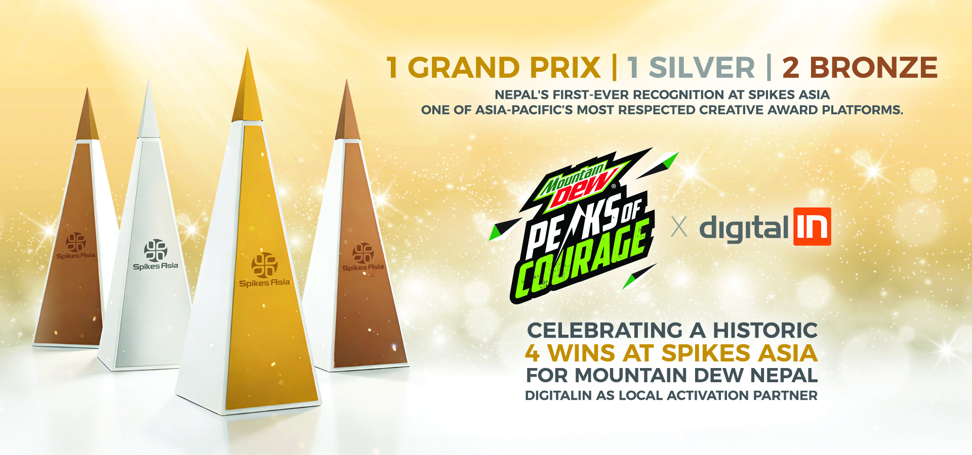 काठमाडौं- माउन्टेन ड्यु नेपालको ‘पिक्स अफ करेज’ अभियानले एसिया–प्रशान्त क्षेत्रको सर्वाधिक प्रतिष्ठित रचनात्मक अवार्ड समारोह ‘स्पाइक्स एसिया’ मा १ ग्रान्ड प्रिक्स, १ सिल्भर र २ ब्रोन्ज गरी कुल ४ वटा अवार्ड प्राप्त गरेको छ । कम्पनीका अनुसार यस अभियानले कम चर्चामा रहेका हिमालहरू र तिनमा लुकेका साहसका प्रेरणादायी कथाहरूलाई उजागर गरेको थियो । कथावाचन, डिजिटल संलग्नता तथा […]