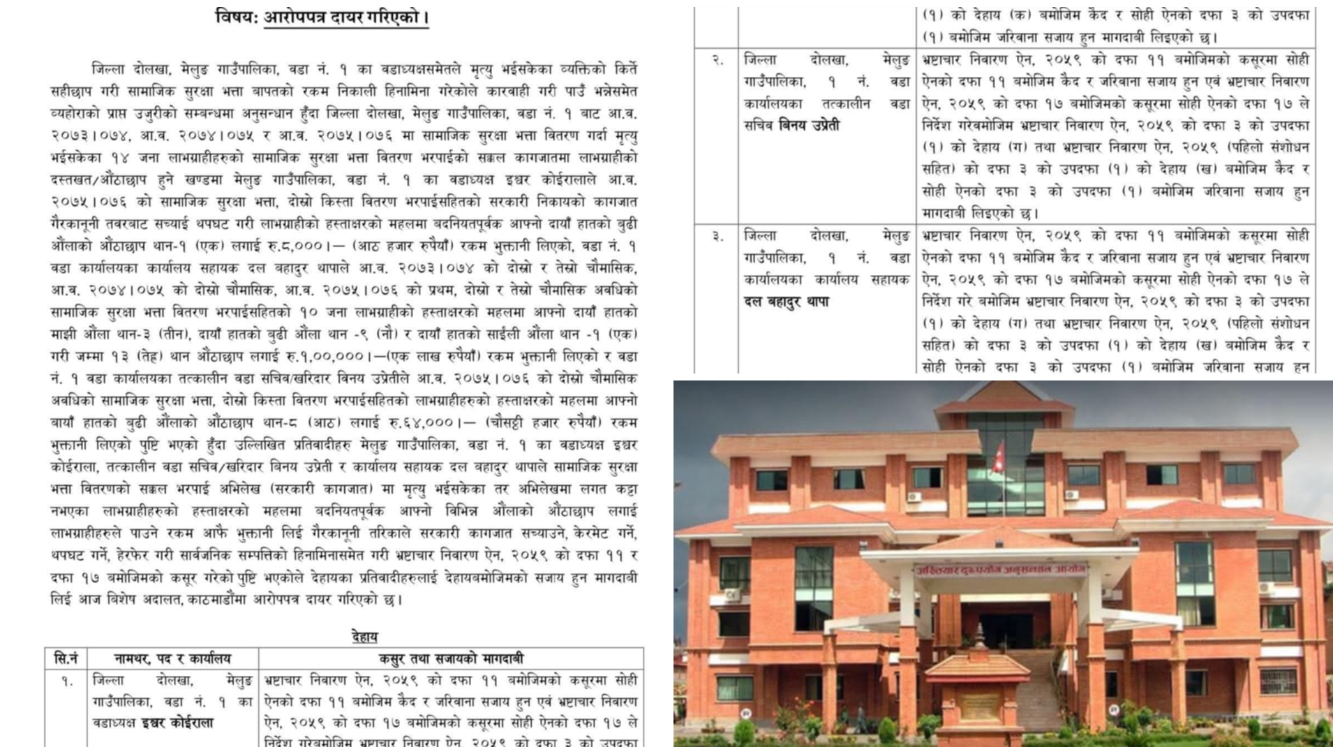 दोलखा– जिल्लाको मेलुङ गाउँपालिका वडा नम्बर-१ वडा अध्यक्ष तथा सचिव र कार्यालय सहयोगीविरुद्ध अख्तियारले भ्रष्टाचार मुद्दा दायर गरेको छ । अख्तियारले मेलुङ गाउँपालिका–१ का वडा अध्यक्ष ईश्वर कोइराला,सोही स्थानका तत्कालीन वडा सचिव विनय उप्रेती र कार्यालय सहयोगी दलबहादुर थापाविरुद्ध सोमबार मुद्दा दायर गरेको हो । उनीहरूलाई मृत्यु भइसकेका व्यक्तिको किर्ते सहीछाप गरी सामाजिक सुरक्षा भत्ता […]