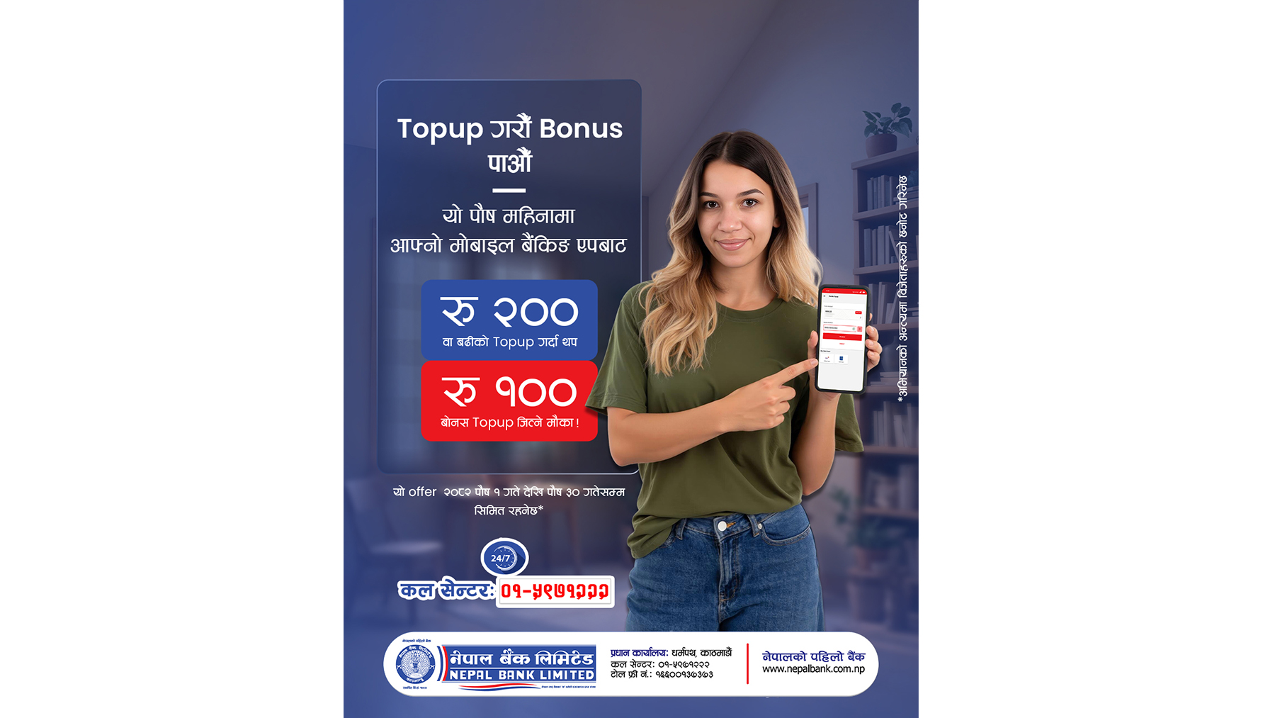 नेपालको पहिलो बैंक नेपाल बैंक लिमिटेडले आफ्ना कर्मचारी तथा बैंकमा खाता रहेका ग्राहकहरूलाई लक्षित गर्दै ब्रान्ड प्रवर्द्धन र डिजिटल बैंकिङ व्यवसाय अभिवृद्धि गर्ने उद्देश्यका साथ ‘टप अप गरौँ, बोनस पाऔँ’ अभियान सञ्चालन गरेको छ ।