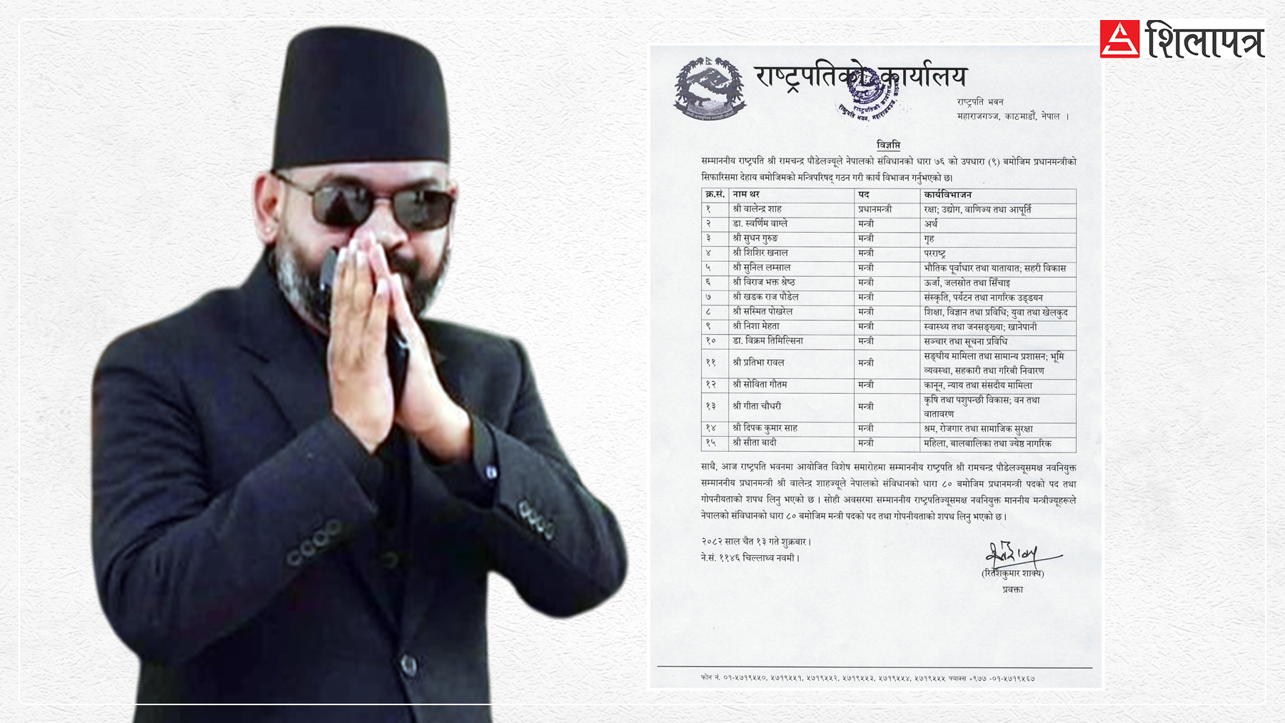 बालेन्द्र शाह नेतृत्वको मन्त्रिपरिषद्को वरीयता निर्धारण भएको छ । बालेन्द्रले प्रधानमन्त्री अतिरिक्त रक्षा, उद्योग वाणिज्य तथा आपूर्ति मन्त्रालय आफैंसँग राखेका छन् ।