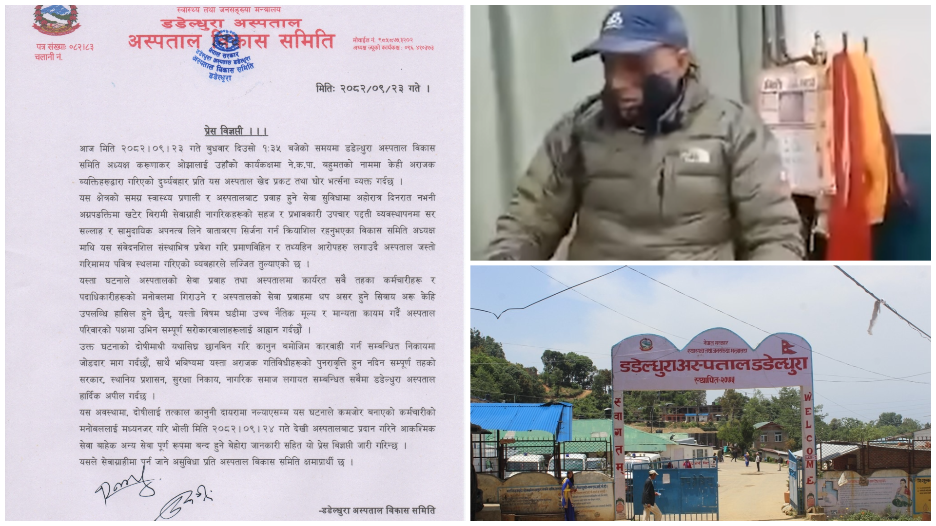 काठमाडौं– डडेल्धुरा अस्पताल विकास समितिका अध्यक्ष करूणाकर ओझामाथि भएको घटनाप्रति अस्पताल प्रशासनले गम्भीर आपत्ति जनाउँदै दोषीमाथि कानुनी कारबाहीको माग गरेको छ । पुस २३ गते दिउँसो १ः३५ बजे अध्यक्ष ओझालाई उनकै कार्यकक्षभित्र ने.क.पा.बहुमतको नाम लिएका केही व्यक्तिहरूले दुर्व्यवहार गरेका थिए । प्रमाणविहीन र तथ्यहीन आरोप लमा भनिएको छ । अध्यक्ष ओझा यस क्षेत्रको समग्र स्वास्थ्य […]